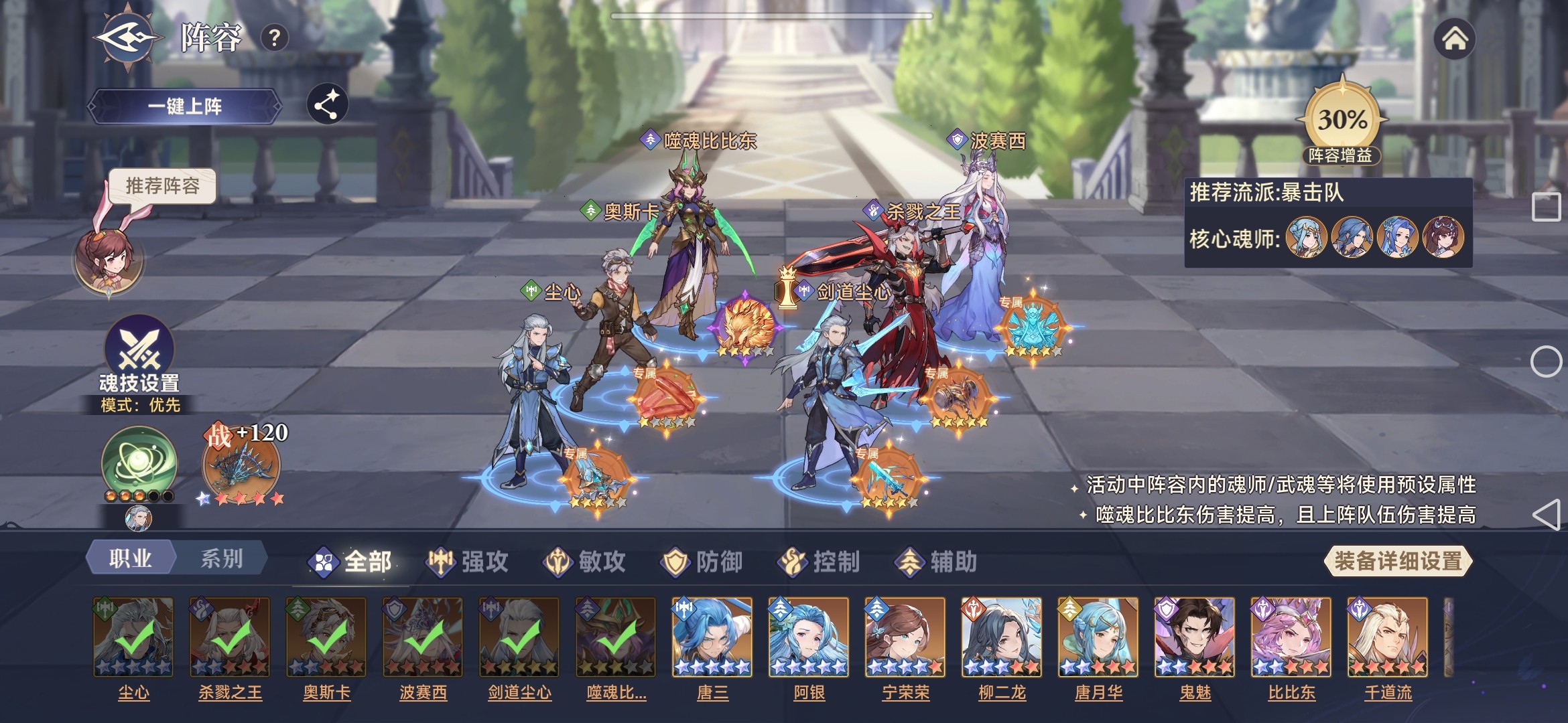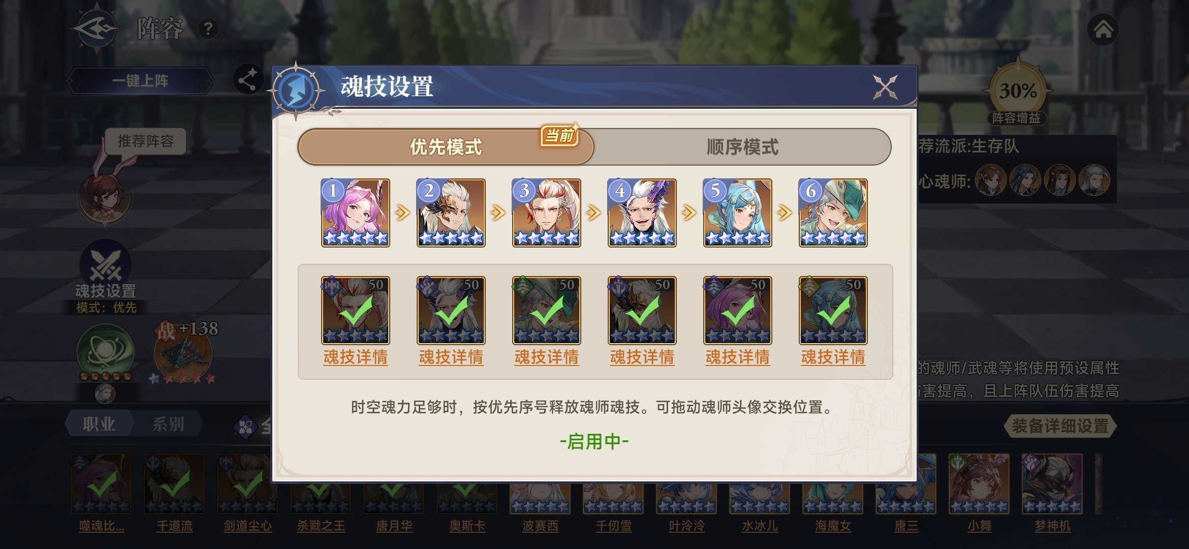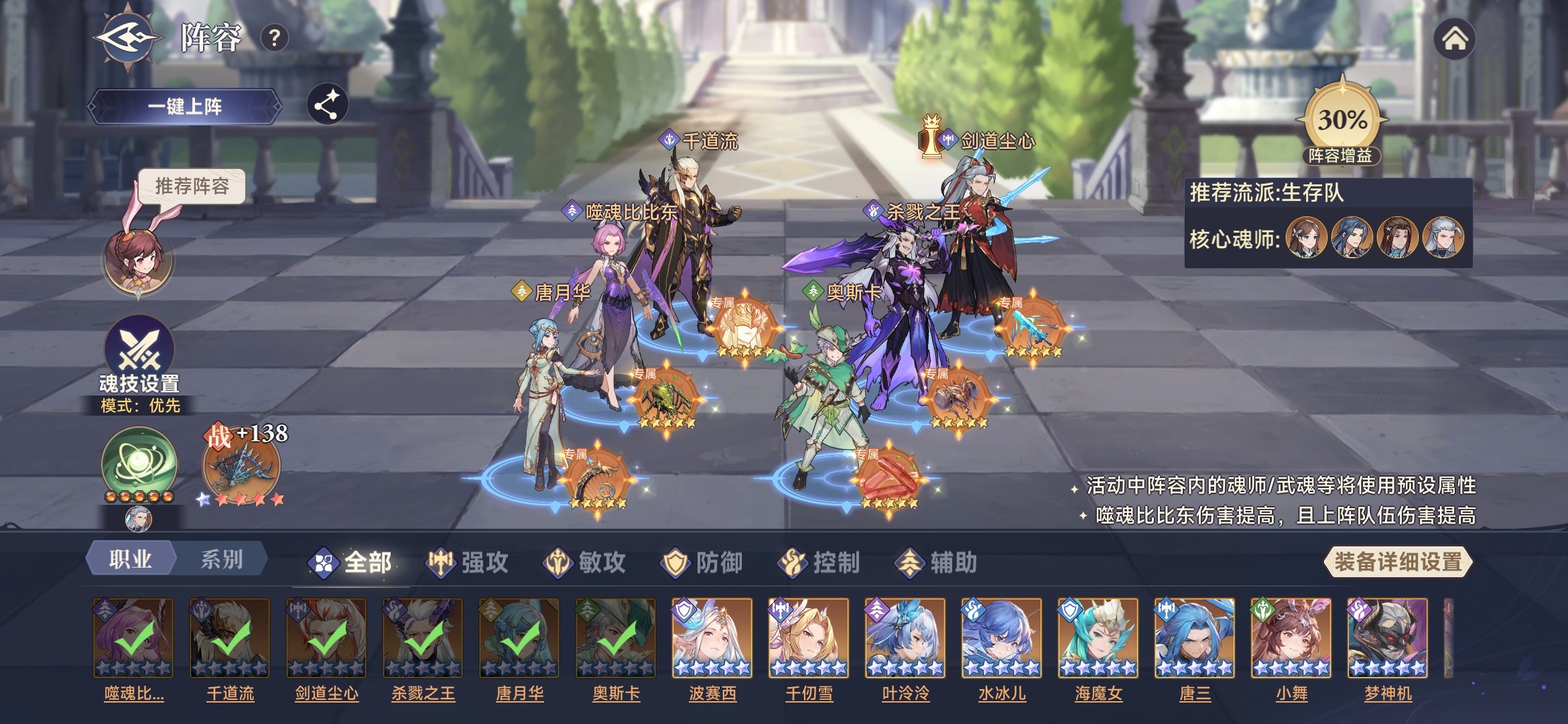 采用优先模式,噬魂比比东、杀戮之王首轮无消耗魂力,放在1号位、2号位,为剑道▪尘心极限输出提供buff支持。剑道▪尘心和千道流放在3号位、4号位,唐月华、奥斯卡魂技顺序无特殊要求。