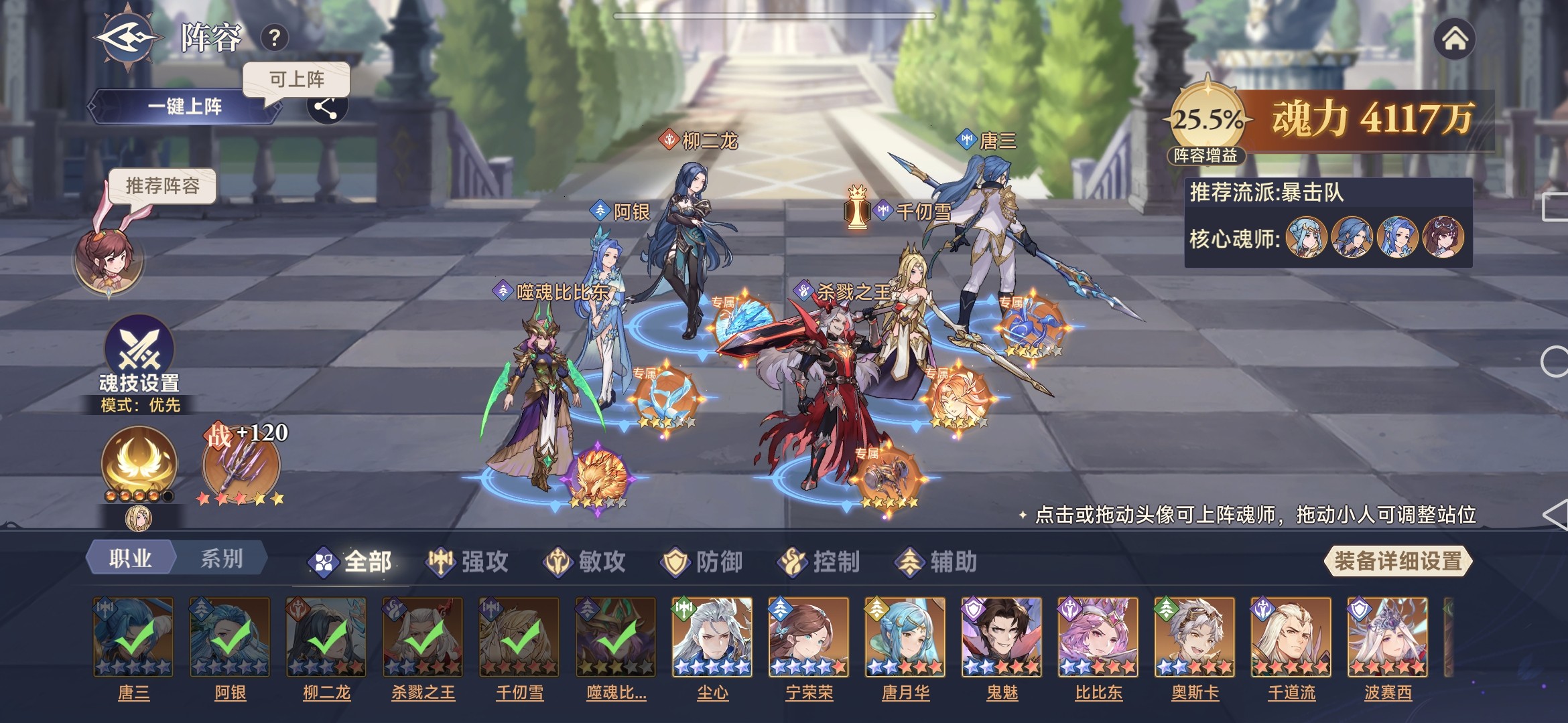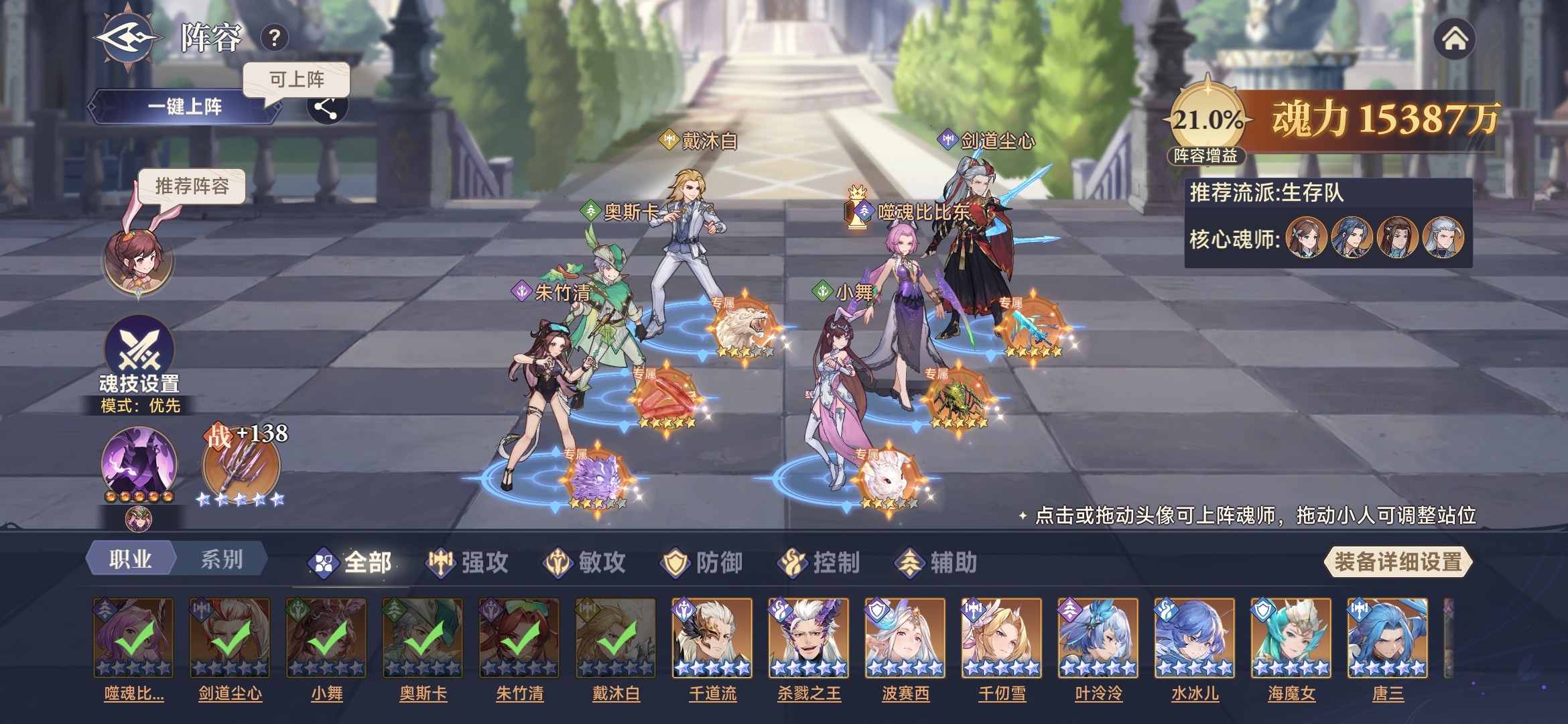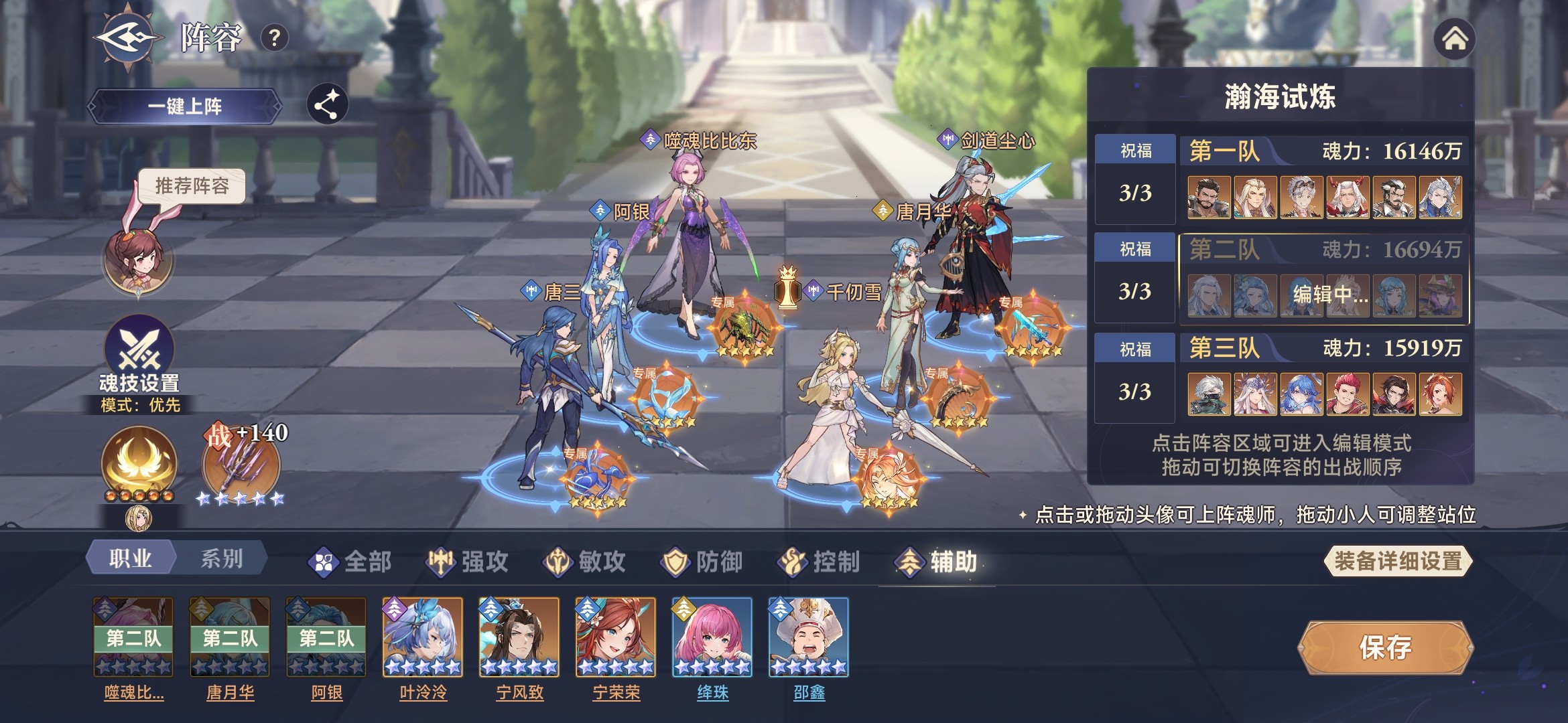 采用优先模式,噬魂比比东、杀戮之王首轮无消耗魂力,放在1号位、2号位,为剑道▪尘心极限输出提供buff支持。剑道▪尘心和千道流放在3号位、4号位,唐月华、奥斯卡魂技顺序无特殊要求。