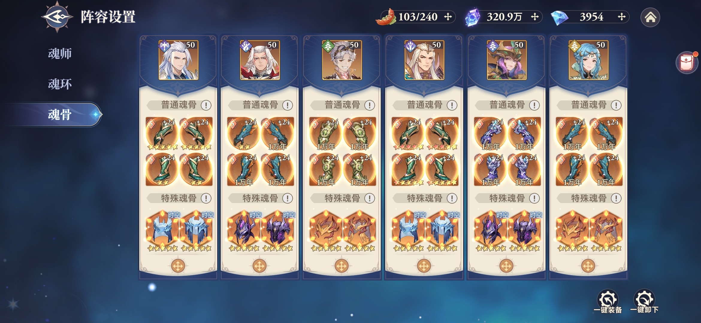 其他魂师的魂骨由系统推荐确定,外附魂骨都选择烈火杏娇疏,而时空魂师搭配时空外附魂骨—八角玄冰草,能够最大限度的为全体提供增伤和减伤。