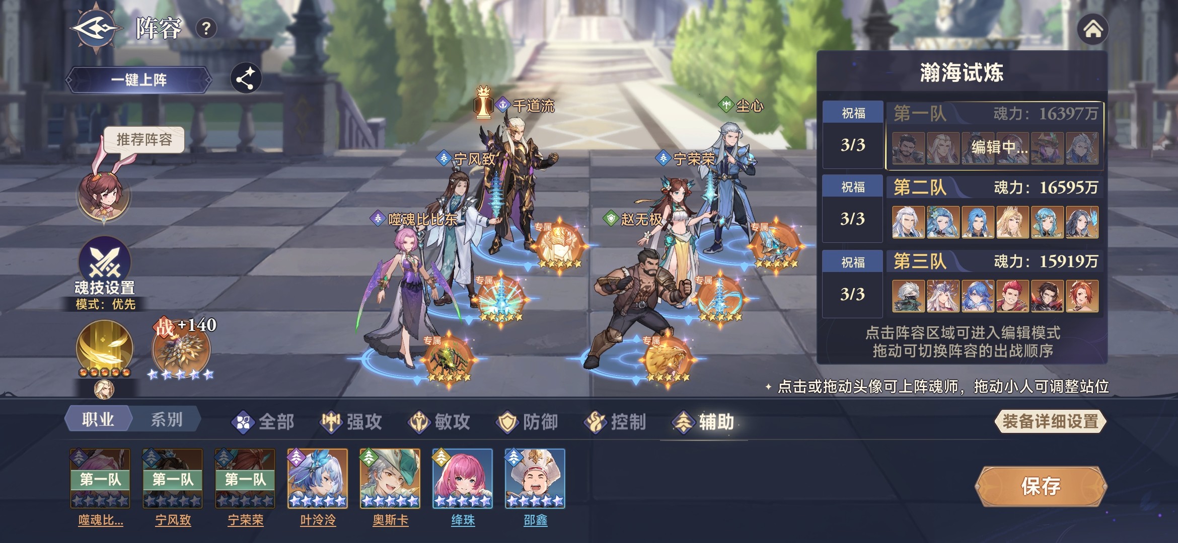 ②常用队伍:千道流+尘心+赵无极+宁荣荣+宁风致+呼延震;增益为【反击】【复苏】【守护】。