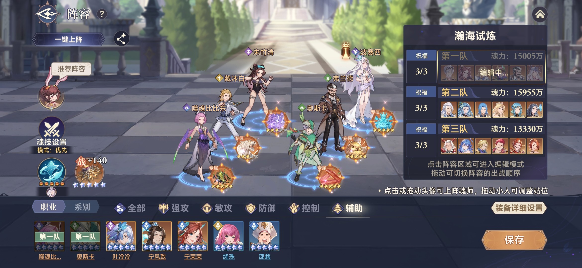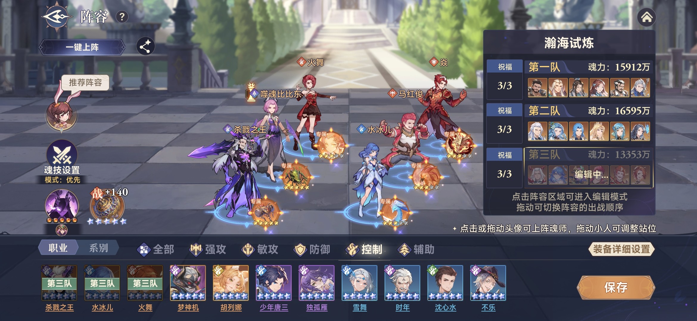 剑道▪尘心作为主C,站1号位,率先出手,杀戮之王作为控制魂师对位敌方首领怪,奥斯卡坦度较高,可以站前排抗伤,噬魂比比东、唐月华在后排,提供增益buff,千道流在后排补充伤害。