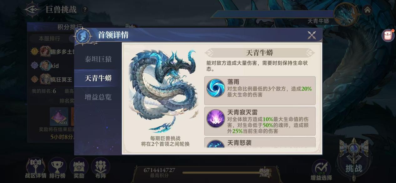 巨兽挑战里有两个BOSS,分别是是天青牛蟒和泰坦巨猿。每次开启的时候会随机出现一个BOSS,两个BOSS的技能是完全不一样的,队伍也不同,天青牛蟒带了两个小弟,而泰坦巨猿是单独BOSS。根据两个BOSS的特点,分析一下怎么围绕噬魂比比东组队打高分。