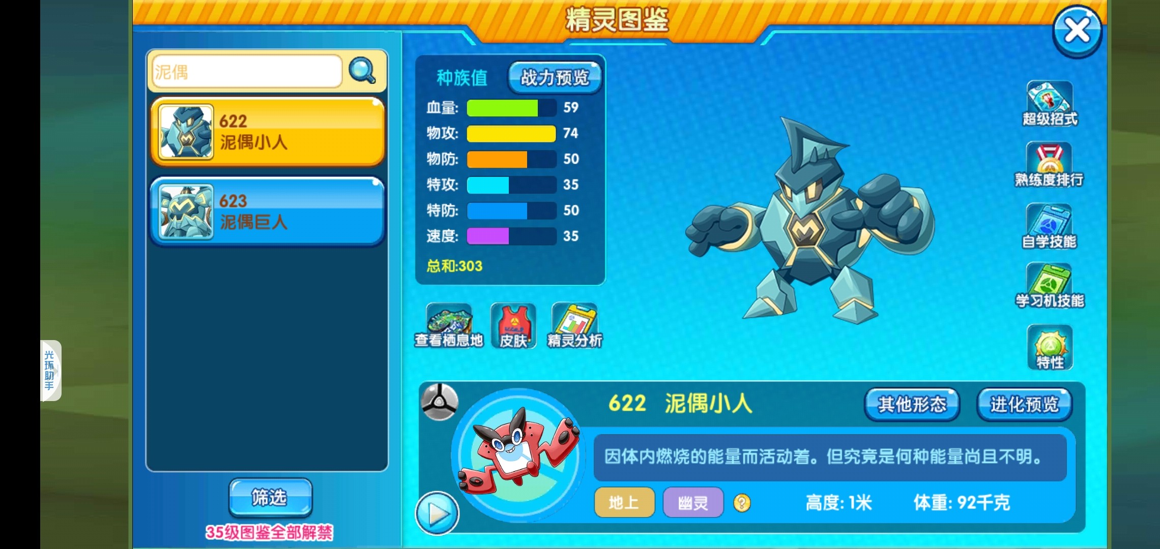 泥偶小人,是地面和幽灵属性,据说是有着超文明的古代人制造出来的!也有一说是用黏土制造而成的人偶,借由古代人所使用的能源在运作。从头部跟手脚根部,以及胸前的印记所发出来的光芒,就是这个能源所发出来的光。将头跟脚缩进去,就会变成球体,它会用这模样攻击敌人。另外,睡觉的时候也会变成球状。