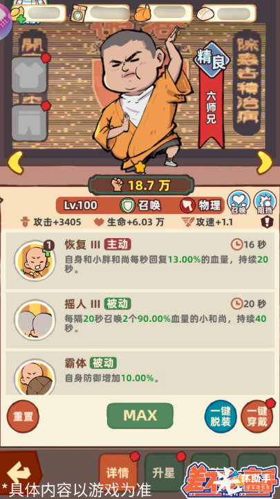 六师兄每隔一段时间,会召唤两个小和尚进入场中,来攻击和吸引敌人;六师兄的被动技能可以增加自己的防御,开启六师兄的主动技能,可以每秒钟给小和尚回复气血。六师兄是前期比较容易获得的召唤伙伴,在前期输出不足,敌人很容易到达老屋的时候,可以选择上阵六师兄试试哦~