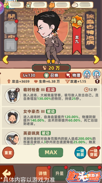 龙九开启主动技能后,会跃入战场,并且会吸引周围的敌人来攻击自己,并且可以增加自己的物防,血量清空或持续时间结束后,会回到老屋;龙九的被动技能可以同时提升自己的物理防御、法术防御和血量,让自己变得更肉,同时还会使攻击龙九的目标受到反弹伤害并降低攻速。龙九的作用十分全面,她的主动技能自带嘲讽效果,强力的被动技能使得龙九更加能抗的同时,还能让龙九造成一定的伤害,可以很好的拖延敌人;并且龙九开启主动技能后或跳到最前方的敌人面前进行嘲讽,也可以有效的保护老屋,建议大侠可以作为主力抗伤伙伴培养~