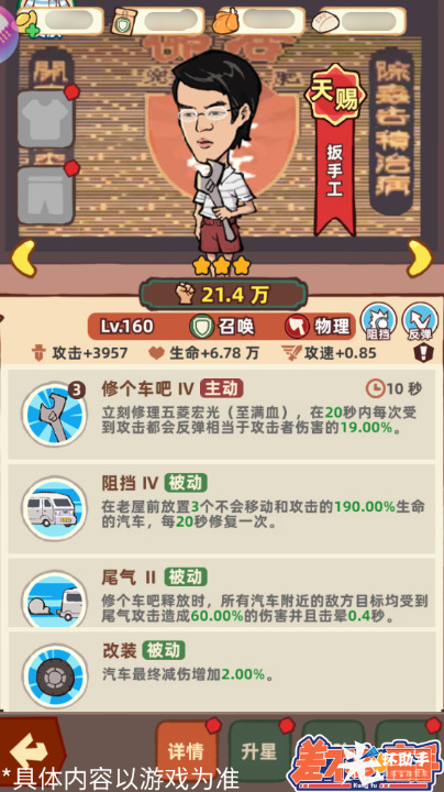 扳手工可以在老屋前放置3个不会移动的汽车,并每隔一段时间修复一次;开启扳手工的主动技能可以立刻修复汽车至满血,并且每次汽车受到伤害都会进行反弹,开启技能时也可以对汽车周围的目标造成伤害并击晕;扳手工的汽车固定召唤在老屋前,来进攻的敌人都会优先攻击汽车,可以为老屋吸收大量的伤害来保护老屋。