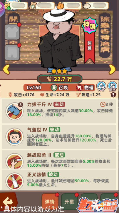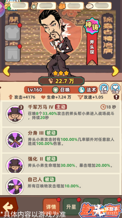 斧头琛和其他召唤伙伴都不相同,他的召唤物是使用主动技能进行召唤的,斧头琛使用主动技能可以召唤多个小弟进入战斗,小弟的攻击还能对额外的任意敌人造成伤害;斧头琛的被动技能还能增加小弟的血量、攻击和暴击;由于斧头琛的小弟是主动技能进行召唤的,并且召唤后就可以进入冷却,所以斧头琛的召唤间隔可以通过堆冷却时间来进行缩减,另外可以配合花姐等减少冷却的伙伴进行配合,并且斧头琛的小弟也有一定的伤害能力,推荐大侠主要进行培养喔~