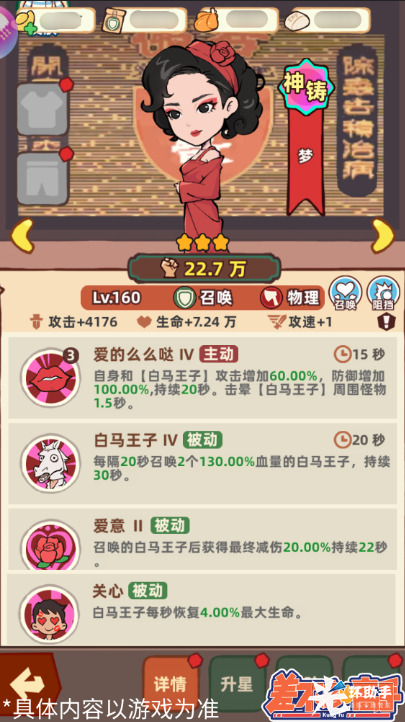 梦每隔一段时间会召唤2个白马王子,梦的被动技能可以给白马王子进行减伤和每秒回复一定的血量;梦开启主动技能,会增加白马王子自身的攻击力和防御力,并击晕白马王子周围的敌人;和电筒西一样,梦的召唤物可以吸收敌人的攻击,而且由于梦的主动技能是可以增加自身和召唤物的攻击力,这样梦和白马王子也有一定的输出能力,大侠可以根据实际需要进行选择~