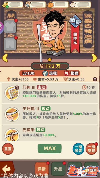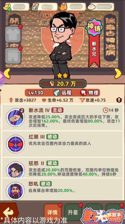断水兄开启主动技能可以瞬间对单个敌人造成11次攻击,被动效果会让断水兄的攻击优先攻击攻击力最高的敌人。断水兄的普通攻击会造成范围伤害,并且会降低敌人的减伤效果和移速。断水兄的特点就是会优先攻击攻击力最高的敌人,可以在乱军丛中取敌将首级,优先解决威胁最大的敌人,并且可以保持集火,在目标消灭前不会转移攻击目标。断水行的缺点就是范围伤害略显不足,大侠可以根据关卡的敌人配置,灵活配置断水兄是否上场。