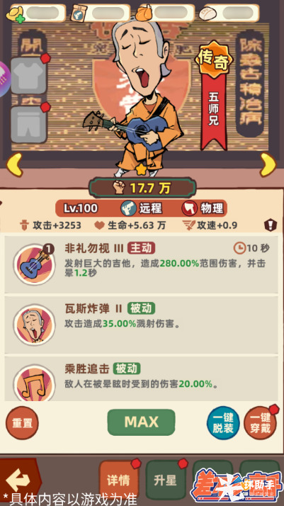 五师兄的主动技能使用可以丢出一个巨大的吉他,对范围内的敌人造成伤害,并且会造成击晕,五师兄的被动可以增加对被击晕的敌人的伤害,并且可以造成溅射效果。