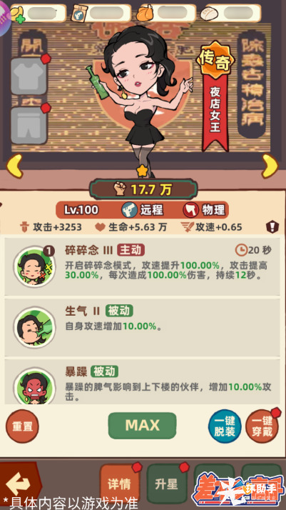 夜店女王开启主动技能可以增加自己的攻速和攻击,被动技能可以提升自己的攻速,并且可以增加上下楼伙伴的攻击力。大侠队伍中若有夜店女王,可以根据夜店女王的被动技能,将夜店女王部署在老屋合适的位置。