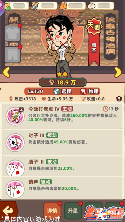 情圣的主动技能会丢出一个巨大的扑克牌,给范围内的敌人造成伤害,并且会降低敌人的物防来增加友方伙伴的物理输出。被动技能可以额外增加自己的暴击和爆伤,还会使自己的攻击增加溅射效果。情圣自身的输出能力较强,且可以削弱敌人的物理防御,大侠可以根据自己目前的阵容进行培养哦~