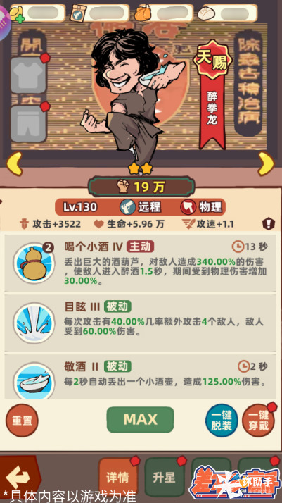 醉拳龙的主动技能会丢出一个巨大的葫芦,对范围内的敌人造成伤害,被造成醉酒效果,醉酒期间的敌人受到物理伤害会增加,被动技能会让醉拳龙忽视目标的物防,每过一段时间会丢出酒碟攻击敌人,并且普通攻击也有概率丢出多个酒碟攻击目标。醉拳龙的自身的伤害不俗,且可以对敌人造成控制效果,并且增加敌人受到的物理伤害,大侠的阵容若是以物理伤害为主,可以选择携带醉拳龙上场。