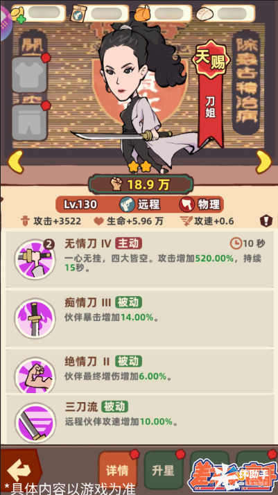 刀姐的技能比较具有特色,她的主动技能会使自己进入无情刀状态,大幅增加自己的攻击力。她的被动技能可以增加全部伙伴的暴击和终伤,且可以提高远程伙伴的攻速。刀姐在队伍中类似图腾一样,可以增加所有伙伴的战斗能力,释放技能也能极大增加自己的攻击力,在面对BOSS战斗时表现突出。