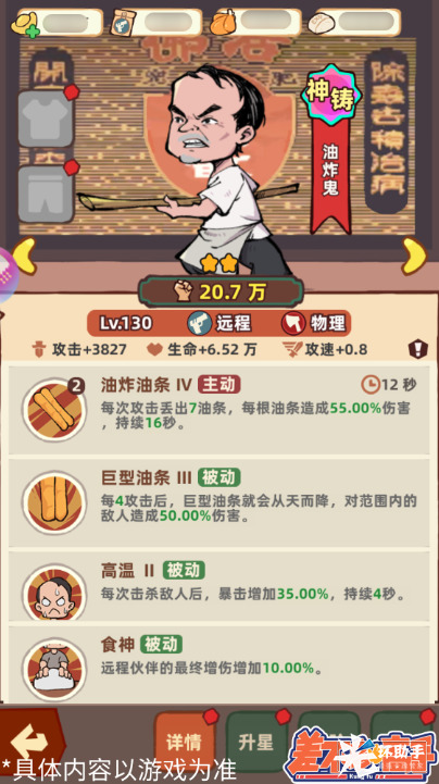 油炸鬼的主动技能开启会每次开启丢出7根油条,对多个敌方造成伤害,被动技能会在多次普通攻击后,丢出巨型油条攻击敌人,造成范围伤害。油炸鬼在每次击杀敌人后,会增加自己的暴击概率,并且可以增加远程伙伴的最终增伤。油炸鬼可以对复数的敌人在一定时间内造成持续性的伤害,并且击杀敌人后可以获得较高的增益,大侠在关卡战斗中可以选择油炸鬼持续的清理小怪,保持增益效果进行战斗。