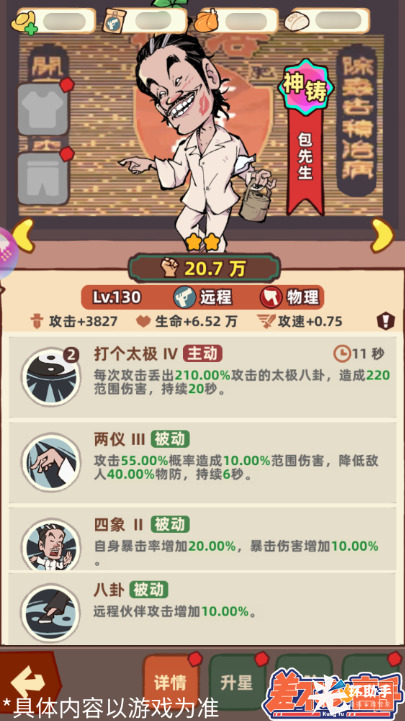 包先生的主动技能会让包先生进入打太极状态,打太极状态下的包先生每次攻击都会丢出太极八卦,对范围内的敌人造成伤害。包先生在进行攻击时有概率造成范围伤害,并且会降低敌人的物防。包先生的被动效果会增加自己的暴击和爆伤,并且会给队伍中的远程伙伴增加攻击力。包先生自身可以对敌人造成大量范围的物理伤害,并且对队友也有不错的辅助效果,大侠若抽到了包先生可以进行培养~