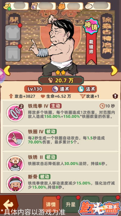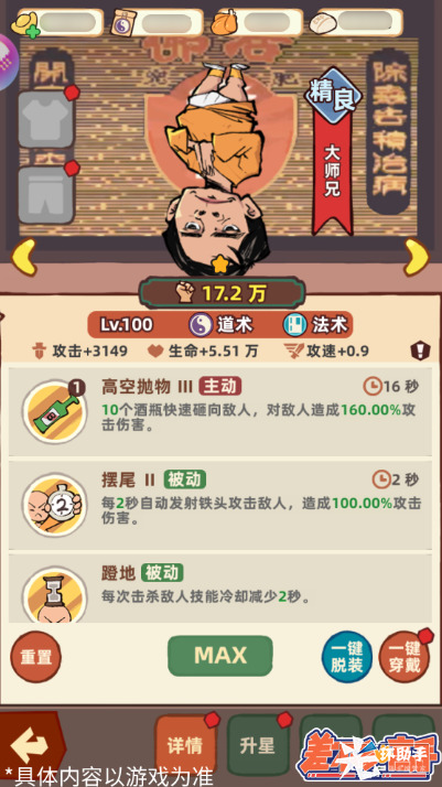 大师兄的主动技能可以在场地中丢出10个酒瓶,对选中的敌人造成伤害;被动技能可以增加大师兄的输出频率,并且击杀敌人后会使两个技能的冷却时间减少,增加技能释放的频率;各位大侠可以在前期使用大师兄来进行过度;