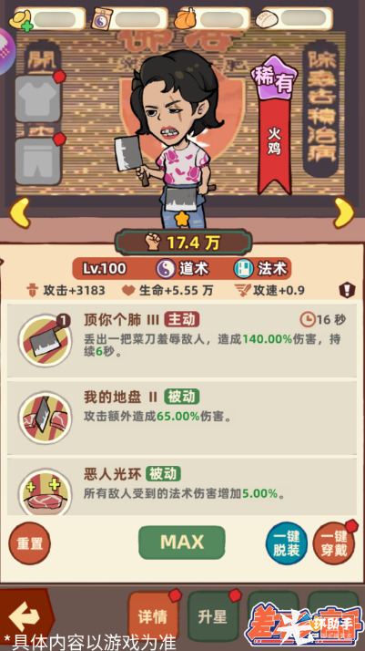 火鸡的主动技能可以使普通攻击变成旋转菜刀,对范围内的敌人造成伤害。被动技能可以增加自己的伤害,并且可以使敌人受到的法术伤害提高,来增加整个队伍的伤害。火鸡是推进主线就可以获得的角色,并且有着不俗的范围输出能力,大侠可以在前期着重进行培养哦~