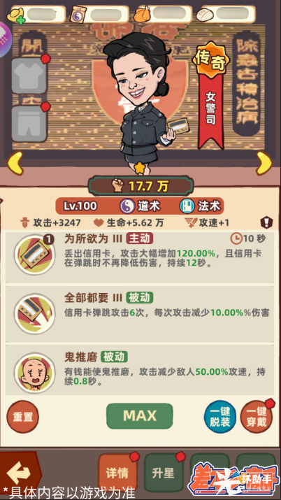 女警司的主动技能是丢出信用卡,被动技能会让信用卡在敌人之间弹跳,并且能减少敌人50%的攻击速度。女警司常态下会有较高范围输出能力,大侠前期如果缺少范围输出伤害,可以选择女警司培养~