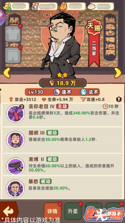 二当家的主动技能是丢出炮梗造成多次伤害,并且可以对攻击的目标造成击晕效果;二当家的被动技能是提升自己的攻击力,使普通攻击有概率进行击晕,并且对生命值60%以上的目标造成额外的伤害;二当家可以瞬间给多个敌人带来大量的法术伤害,当只有一个敌人时,二当家可以瞬间对这个敌人造成多次伤害,单体爆发能力很强;大侠可以根据需要,将二当家作为主要输出角色进行培养,在竞技场等需要瞬间爆发伤害的地方可以使用。