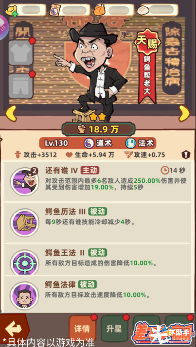 鳄鱼帮老大的主动技能是对范围内的最多6名敌人造成伤害,并且使目标敌人的受到的伤害增加。被动技能减少主动技能的回转,并且会减少敌人的伤害和攻击速度,在竞技场战斗中有一席之地,大侠可以选择进行培养。