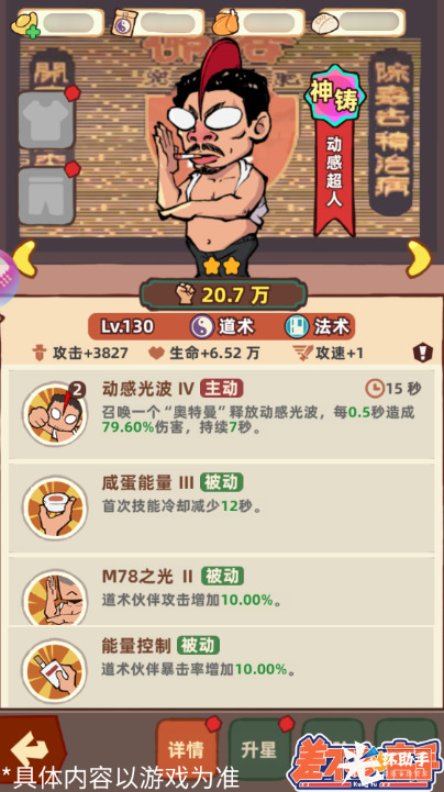 动感超人拥有强大的群体伤害能力,释放主动技能可以释放动感光波,对场上的所有敌人造成持续性的伤害,并且动感超人的被动技能可以减少首次冷却时间,开局短时间内可以释放两次技能,对全体敌人造成大量的伤害,并且动感超人会给队伍中的道术伙伴增加暴击率和攻击力。动感超人可以对群体敌人造成大量的伤害,若大侠抽到了动感超人可以围绕动感超人进行配队,着重进行培养。