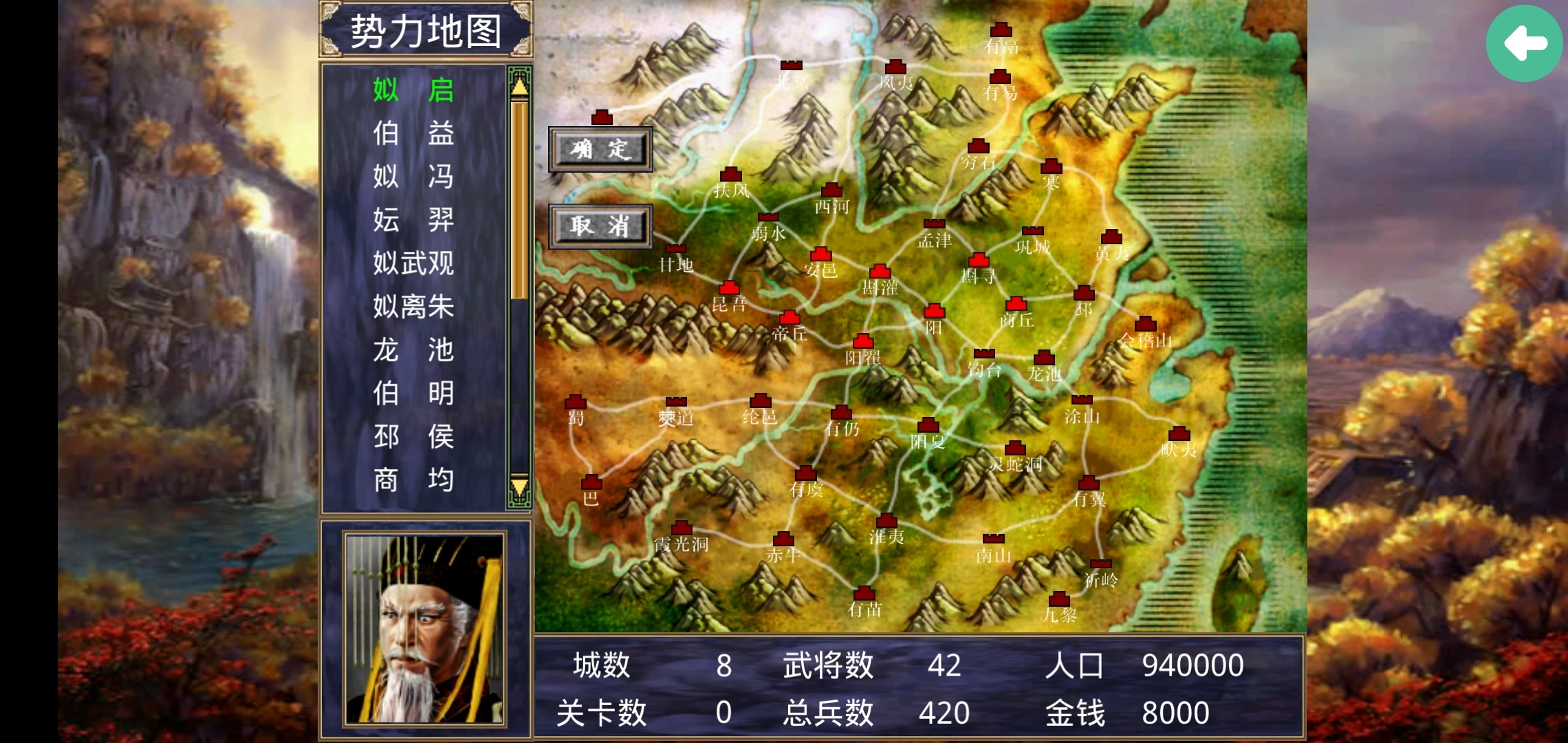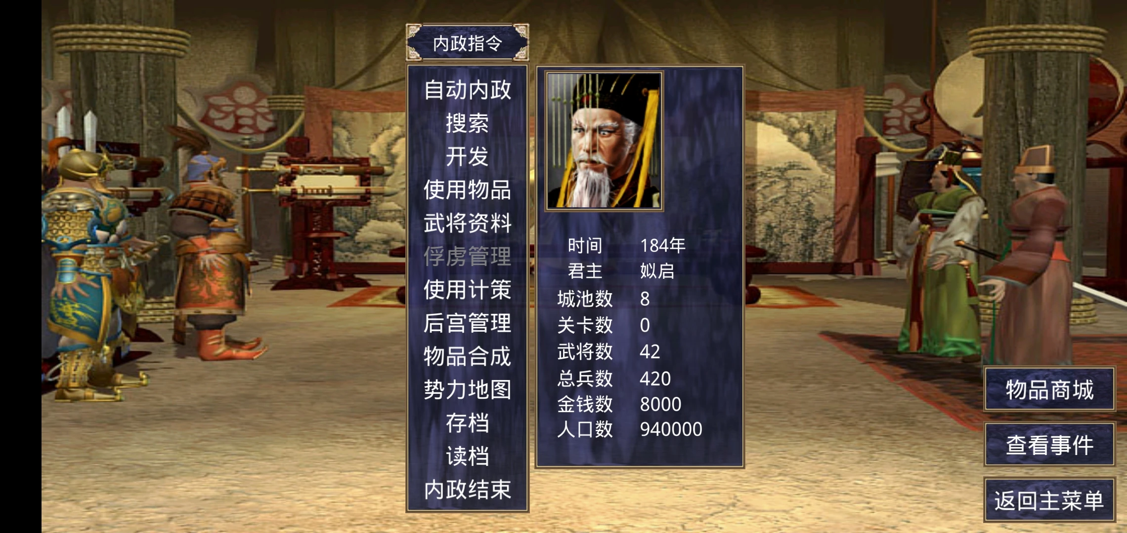选择自己看中的势力,通过自己的努力让其发展成为顶尖势力。不同的势力所占据城市的数量、拥有的武将等等都有所不同,这就意味着初始实力有高有低。进入游戏之后在其中有着丰富的内政指令,能否很好的管理一个国家是君王的必备技能呦!通过搜索玩家可以寻找到势力范围内的宝物,武将等以增强自身的势力,让自己在这个群雄争霸的年代里占据一席之地。玩家也可以选取自动内政,设定出势力发展的大致方向,偏向建设还是偏向攻略城池。开发,玩家可以针对单一城池有计划地进行发展,开发过后城池的居民数量会大幅度上升,同时城池的建设值也会得到一定程度的提升。在玩家的发展过程中,武将作为冲锋陷阵的关键力量,具有着举足若轻的地位,玩家可以通过花费一定数量的金币在物品商城里购买更多的高级装备、马匹、道具让自己的武将拥有更高的实力,这一切都可以在武将资料中轻而易举地获得。为了更快的统一全国,玩家还可以使用离间等战略计策,每一次内政结束都是下一个月的开始,你有信心在20年内统一全国么?