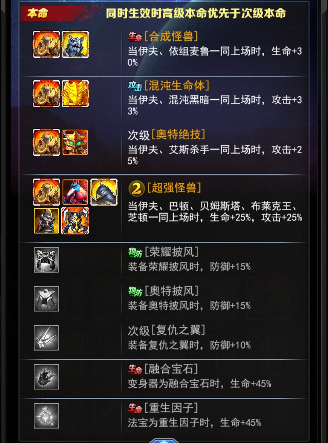 勋章(以紫色为基准),套装可选择:迪迦、奥父、泽塔伽马、贝利亚、奥王、眼q(尽量先以防御流为主,再考虑攻击和暴击)。(后面的是主属性)一号位:攻击 二号位:百分比攻击 三号位:防御 四号位:百分比防御 五号位:生命 六号位:百分比生命