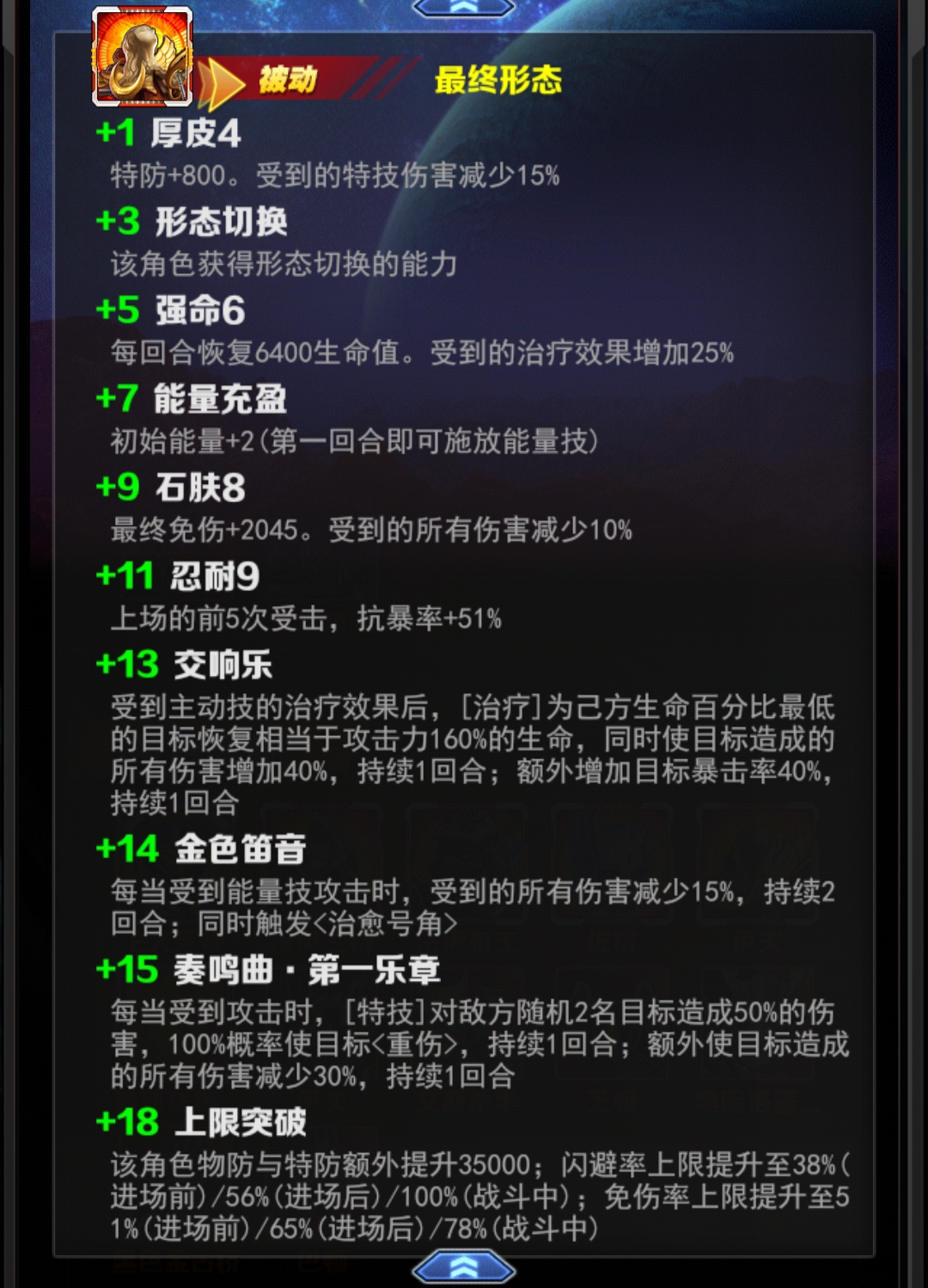 +14,受能量技攻击时受到所有伤害减少15%,2回合,同时触发叶腐的普通技。复习下叶腐的普通技,给自己回复80-120%攻击力生命并为当前我方生命最低的角色提供1回合的40%格挡,这算是个缩水版能源同化,增加了叶腐的坦度,能在高端对局里站的住脚跟