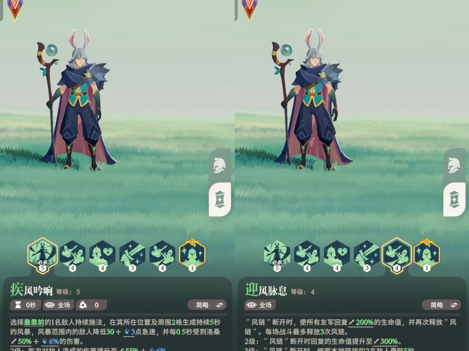 ⑤专属技能:迎风脉息。风链断开,就可以回复全体友军的高额生命,同时可以马上接着释放风链。