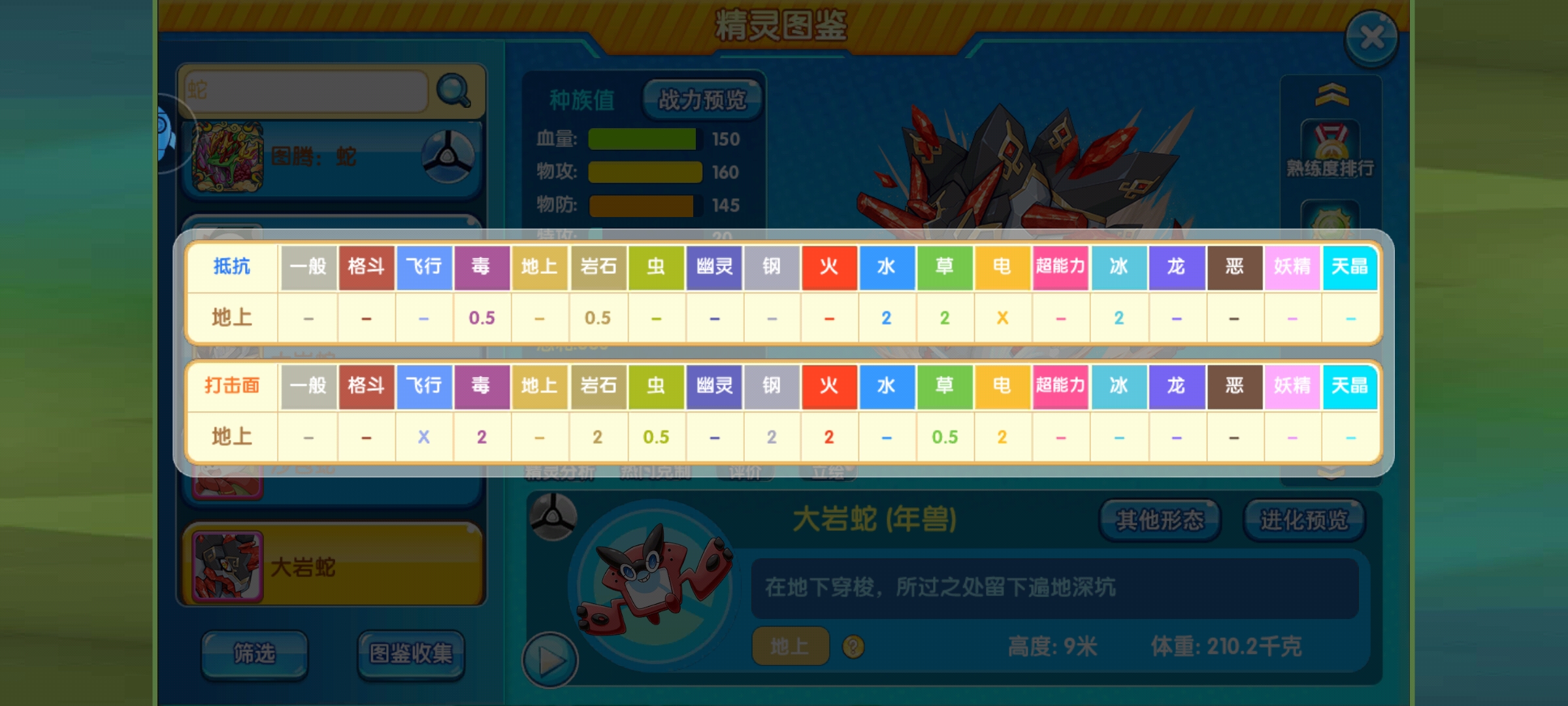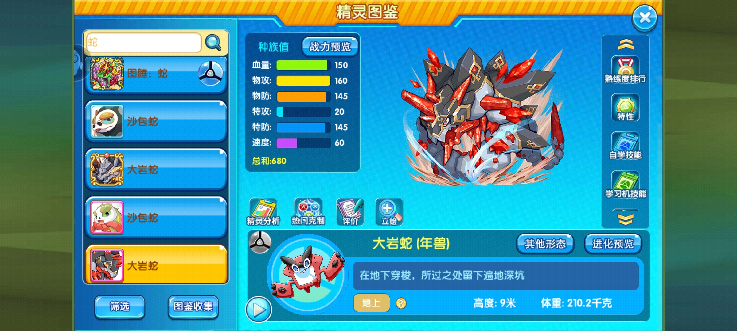 总结:大岩蛇如今在复刻中以年兽新形态重新启航,官方虽然设计了个贴合精灵的新特性,但是限制很大,强度一般,只能希望以后能有作为,总之,个人认为大岩蛇的可玩性是真不高,本次攻略主要给大家提供一个参考,如果各位有其他强大的套路或者不懂的问题也可以留言讨论。