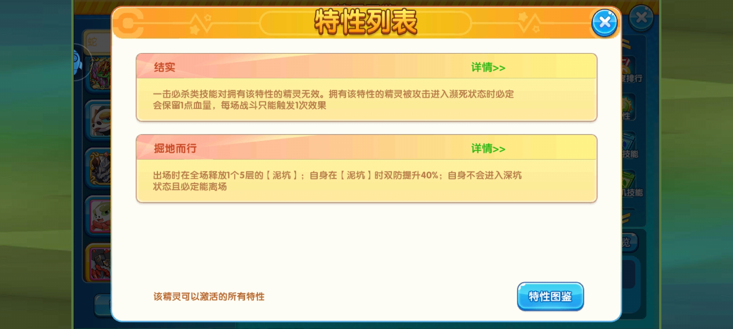 总共6个特性,不过就我个人建议,当然是选择新特性掘地而行了,效果是出场时在全场释放1个5层的【泥坑】;自身在【泥坑】时双防提升40%;自身不会进入深坑。