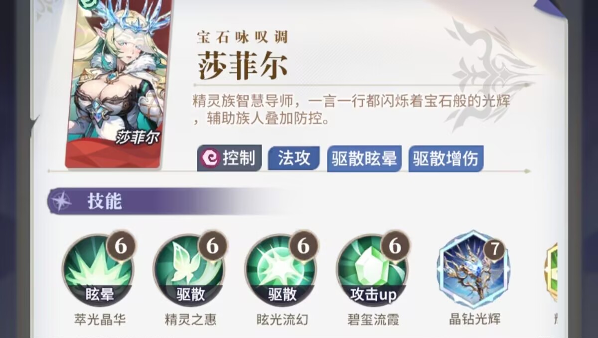莎菲尔:眩晕控制+驱散,配合上冰冻阵容的丝黛拉也是很好用,加强队伍控制同时又可以驱散敌人的增益。