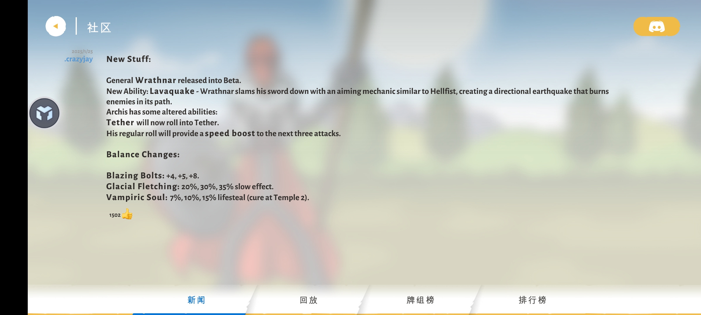《好消息来了》wⅰn!发布于 01-25关注我将CJ发的文段翻译了一遍,以下是翻译内容! 翻译:新内容:•将军Wrathnar 已进入Beta测试。 •新技能:熔岩震击 - Wrathnar 用类似于Hellfist的瞄准机制将剑砸下,创造出一个方向性的地震,烧灼路径上的敌人。•Archis 的一些技能有所改动: •束缚 现在会滚动到束缚。•他的常规滚动将为接下来的三次攻击提供速度加成。平衡调整:•炽烈箭矢:+4, +5, +8。•冰霜箭羽:20%, 30%, 35% 减速效果。•吸血之魂:7%, 10%, 15% 吸血(在神庙2治愈)。
