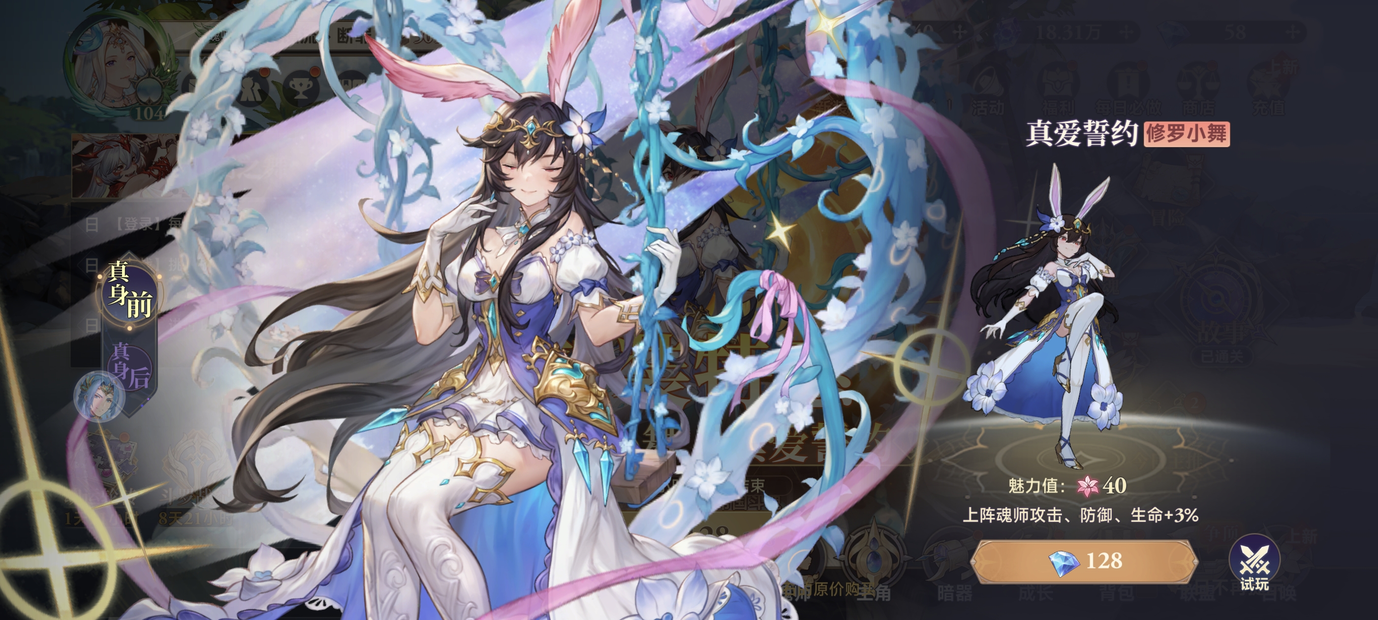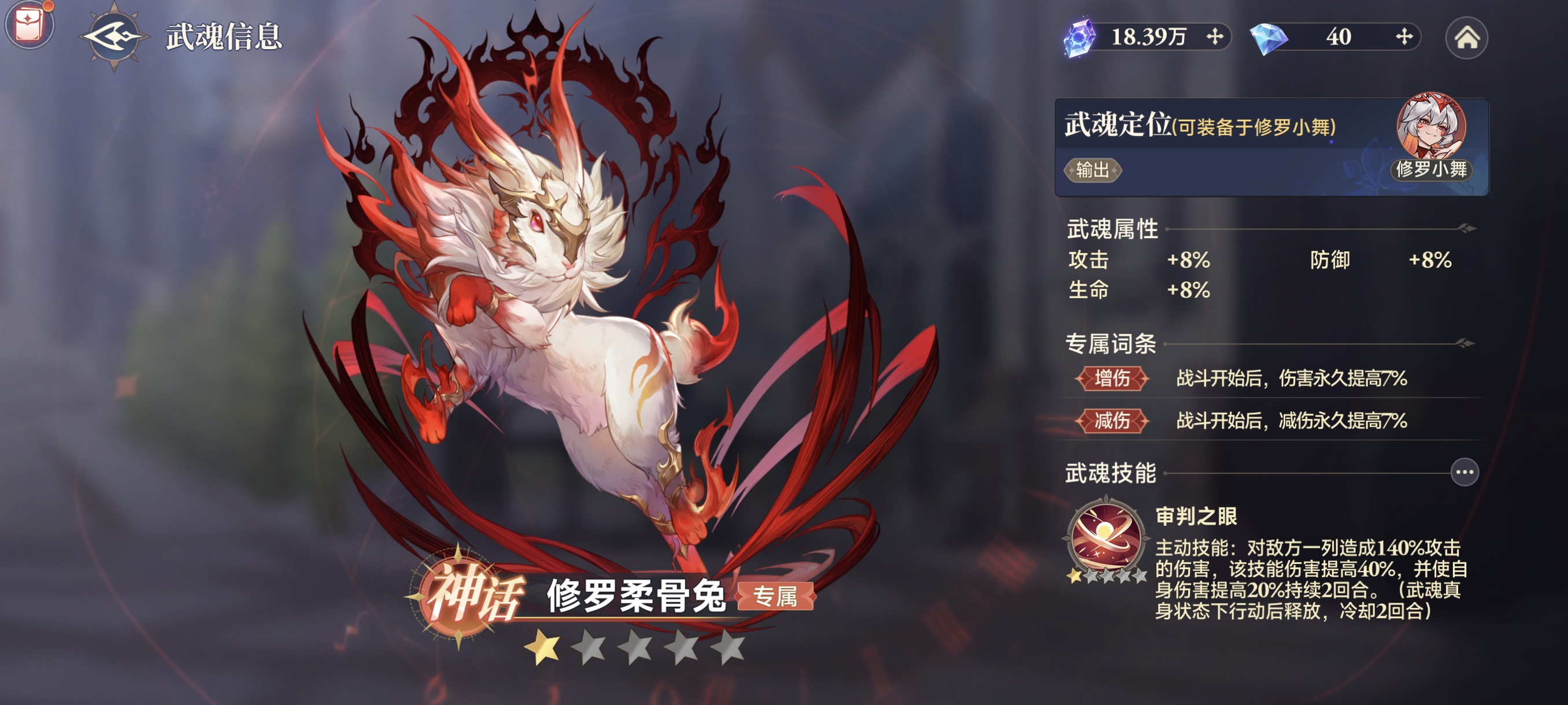三、专属武魂-修罗柔骨兔1星,武魂技-审判之眼140%系数列攻,该伤害提高40%,并使自身+20%增伤,持续2回合。