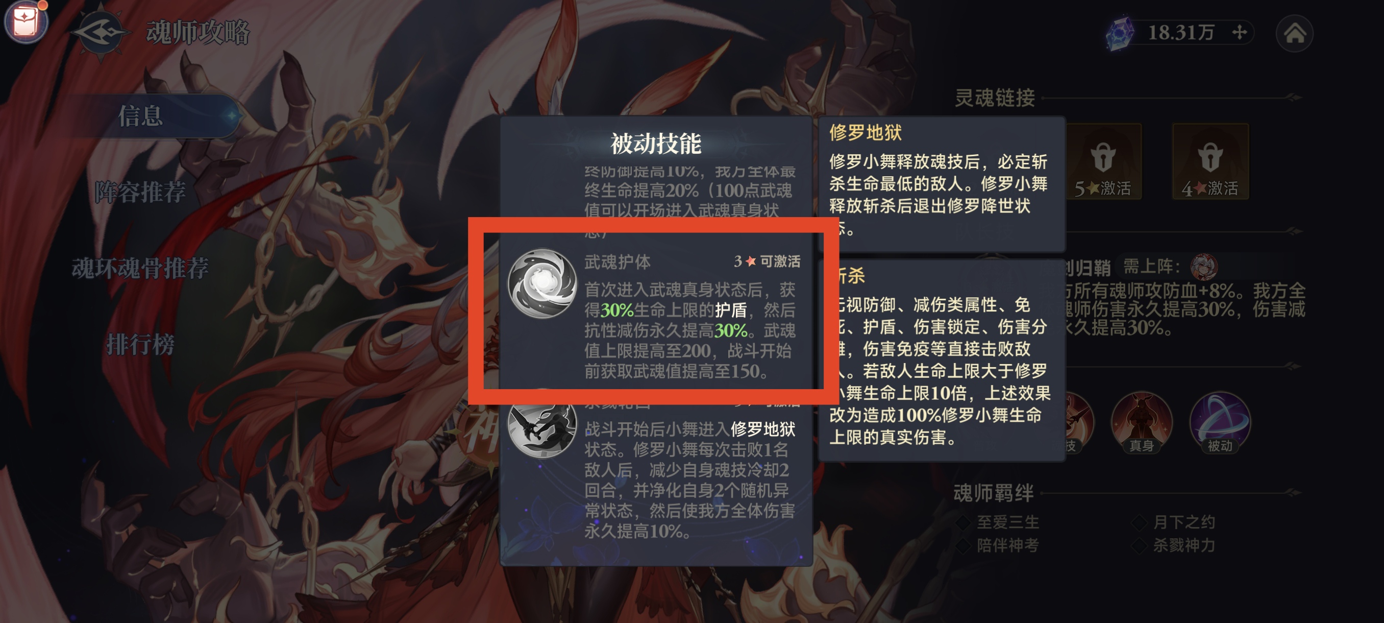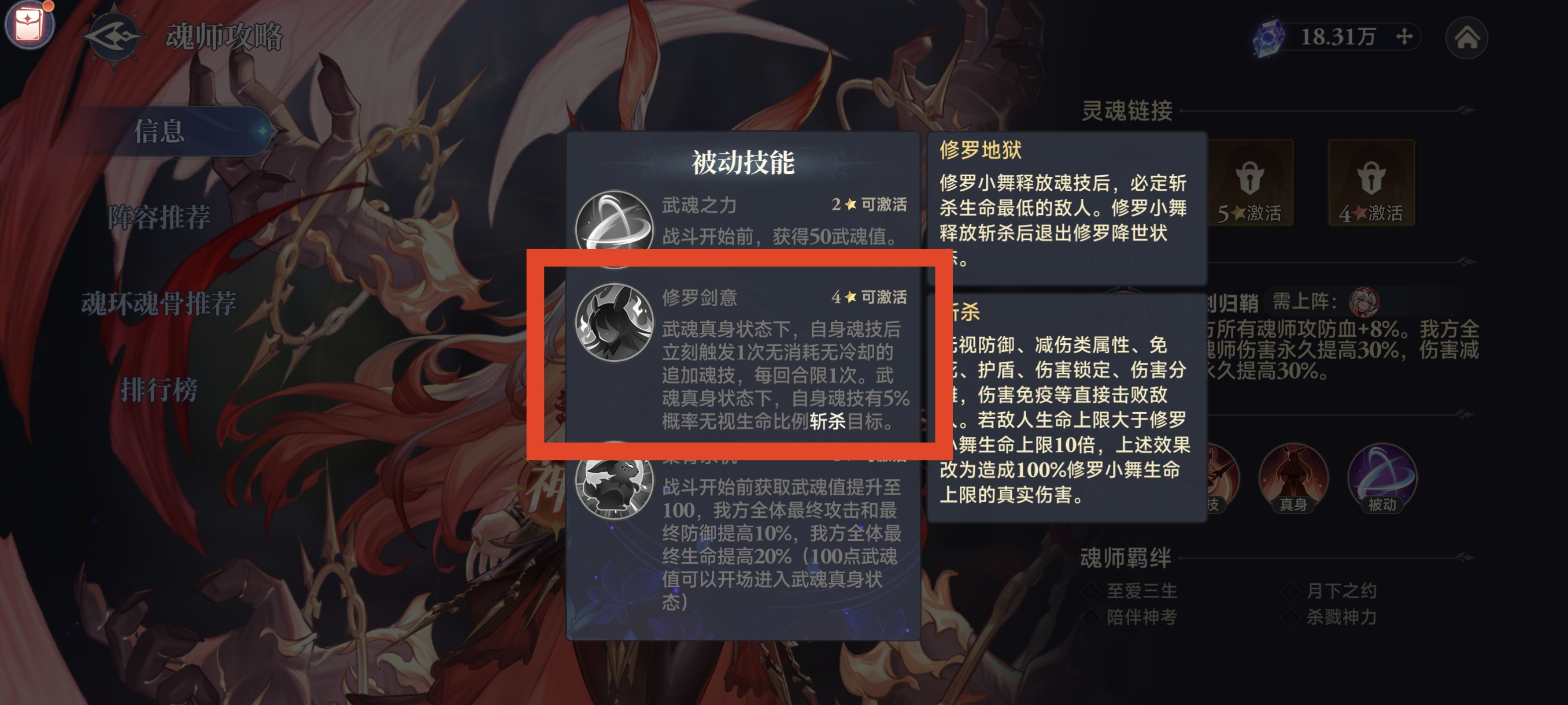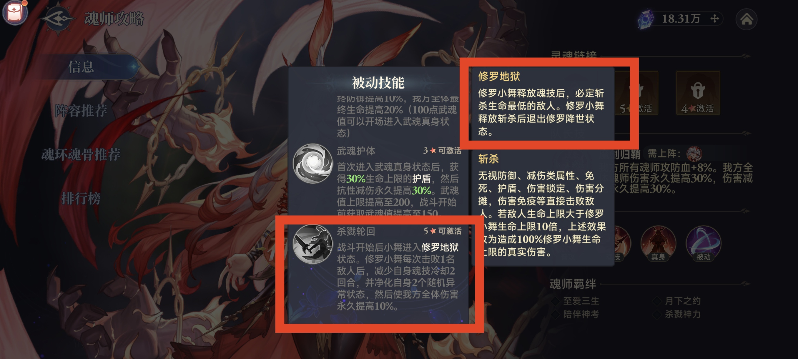 修罗地狱是小舞的核心机制之一,能在开场首次魂技必定斩杀敌方血最少英雄,同时刷新魂技冷却并提升全体增伤。