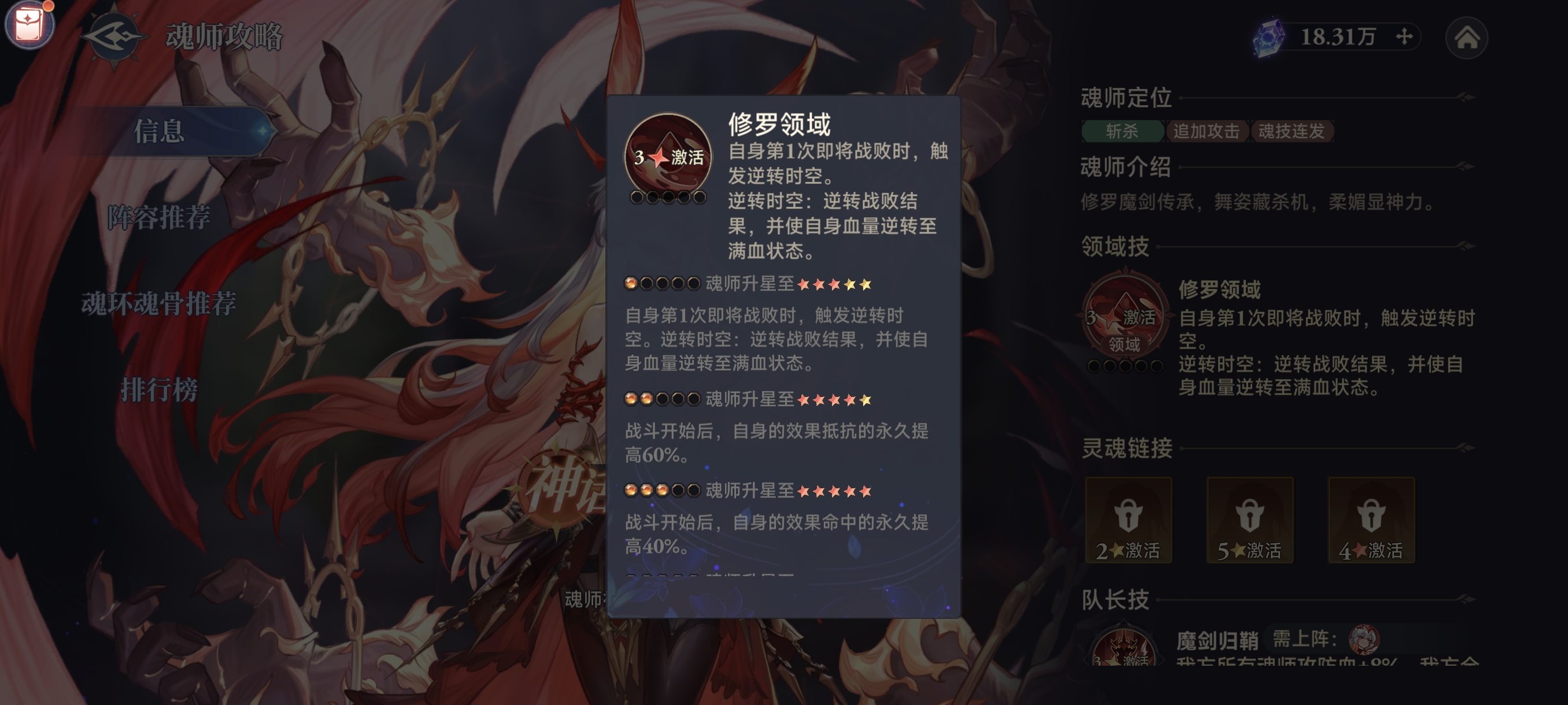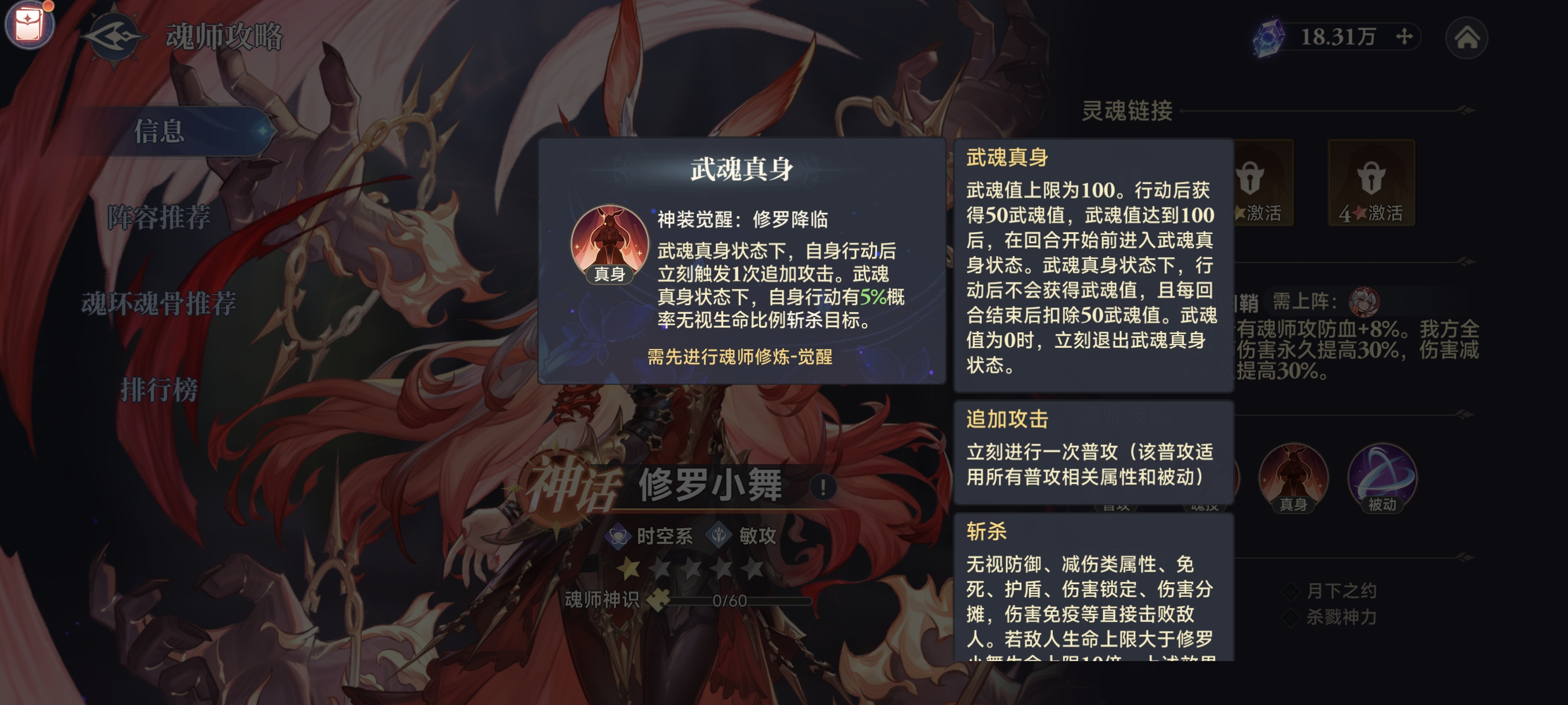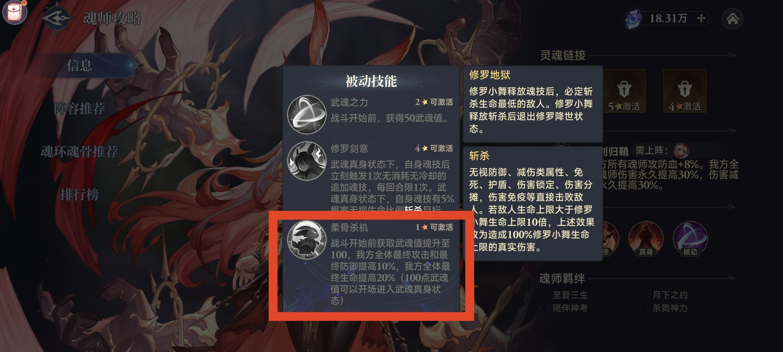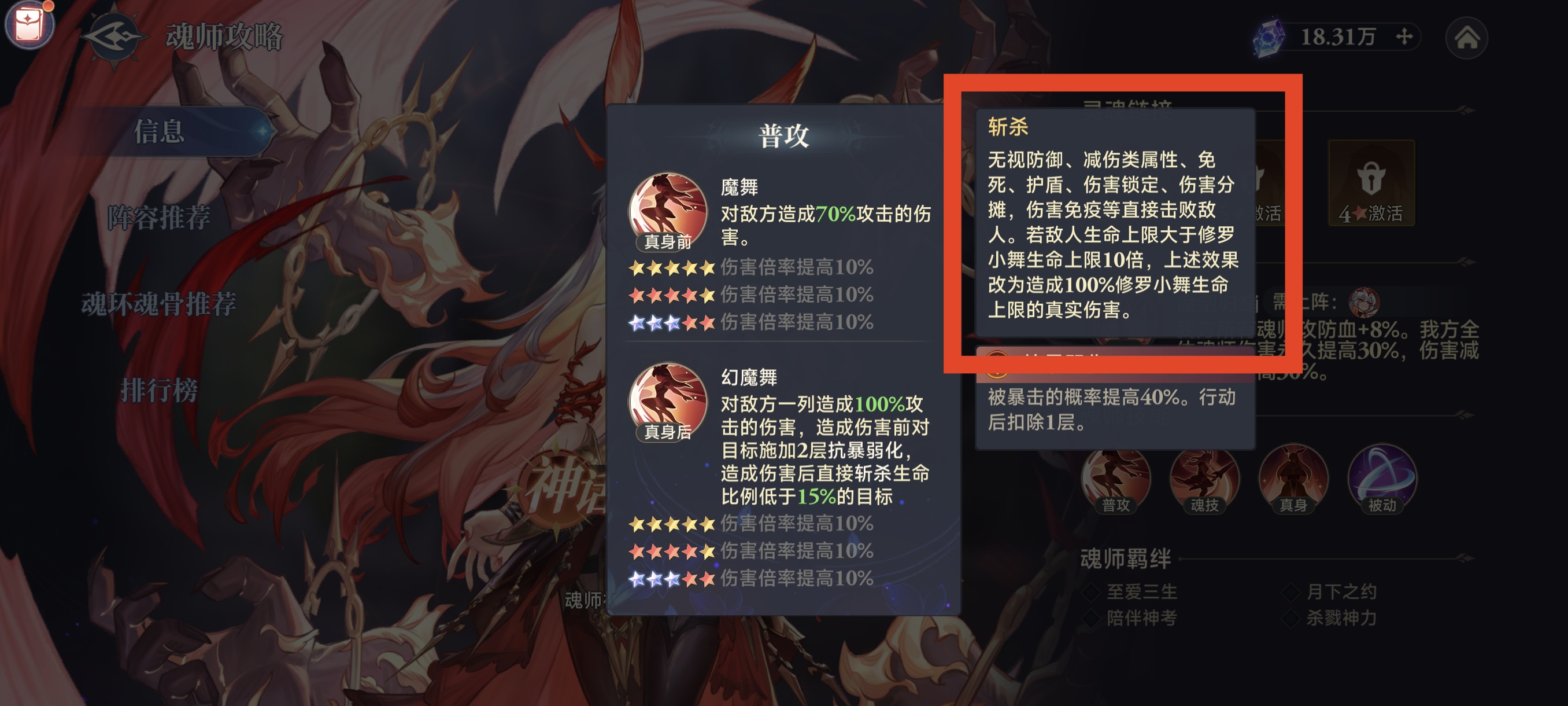 修罗地狱是小舞的核心机制之一,能在开场首次魂技必定斩杀敌方血最少英雄,同时刷新魂技冷却并提升全体增伤。