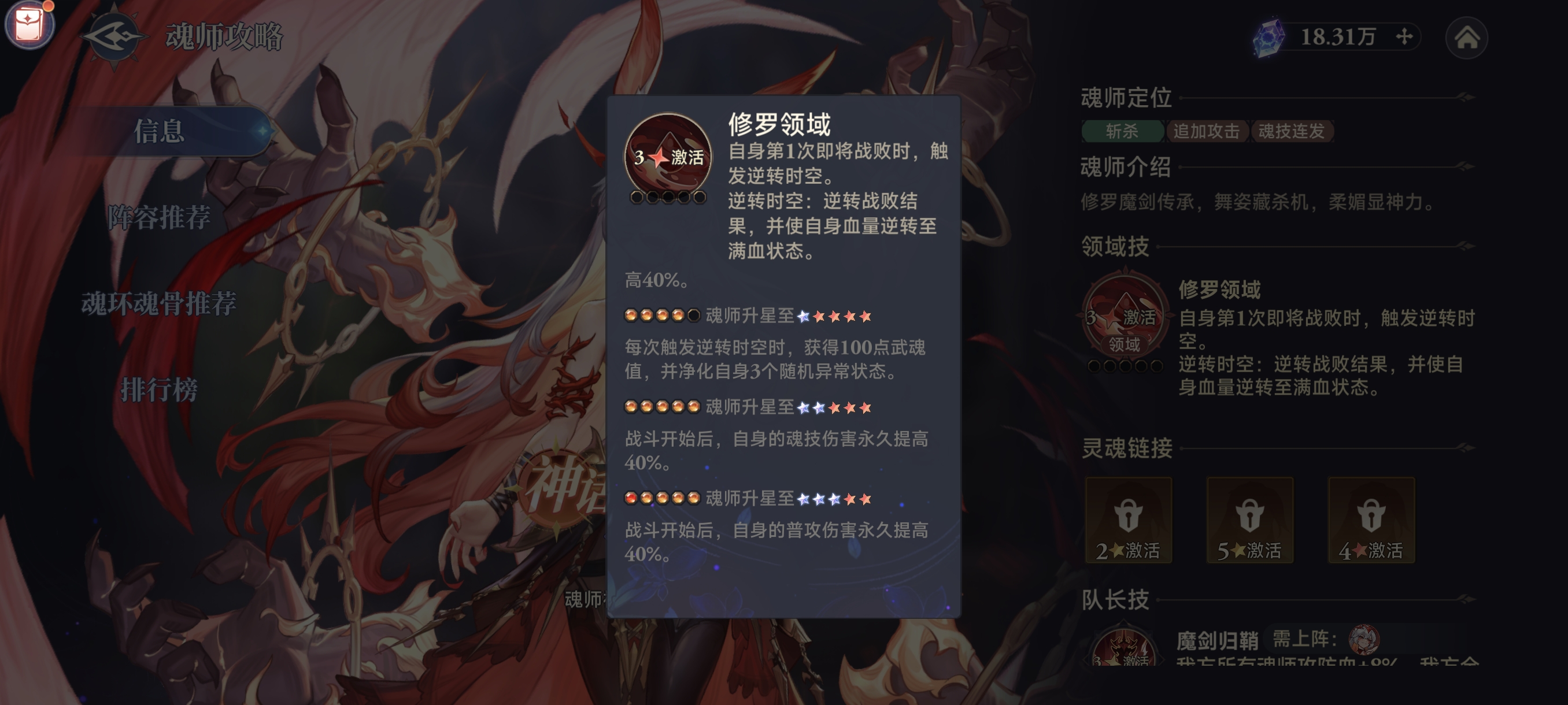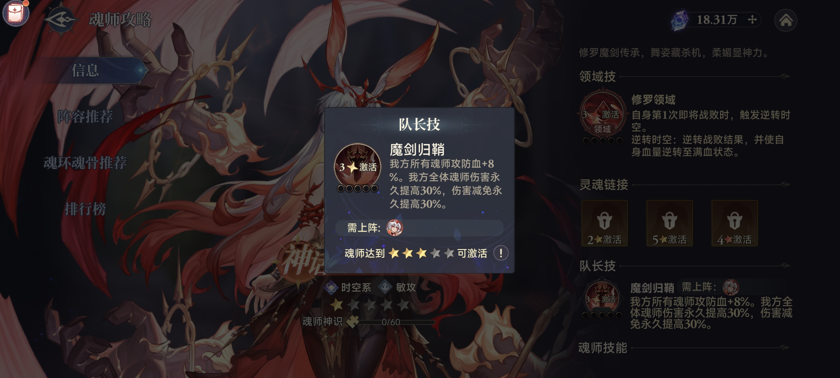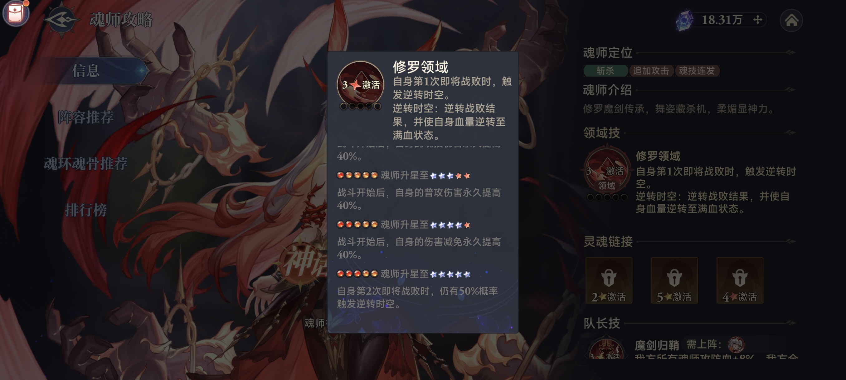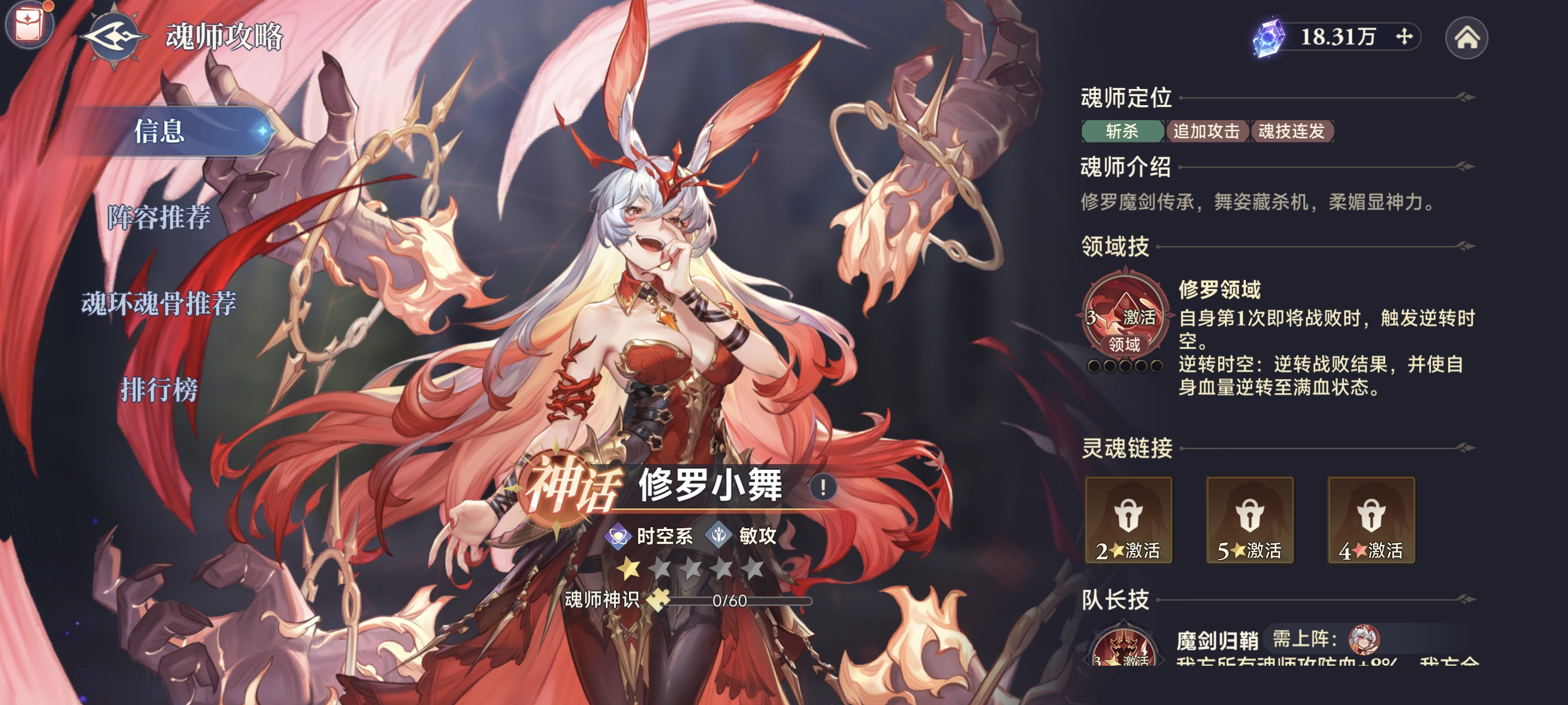 五、适配阵容推荐修罗小舞因为是全新的神话品质,相比传说品质的时空英雄在各方面都有绝对领先,尤其是灵魂链接的巨额属性加成更是极大拉开了与传说时空的差距。所以在任何阵容中,都可以替换掉老时空输出位。