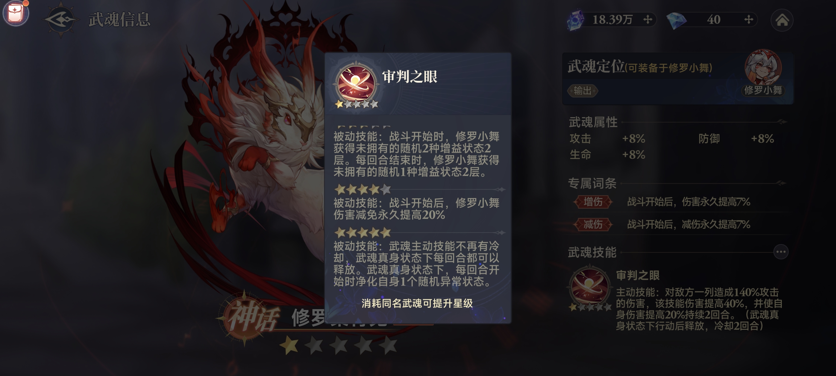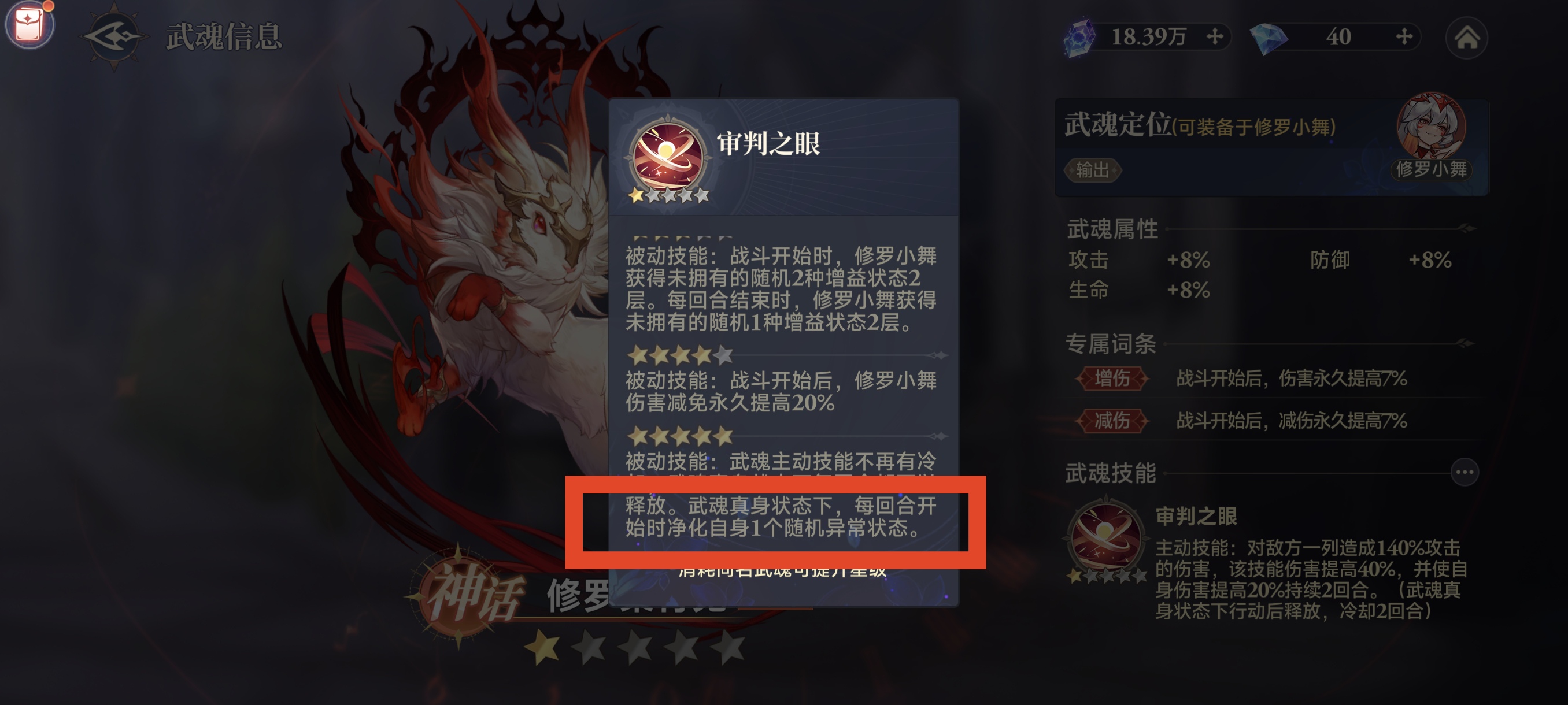 小舞本身的普攻/魂技均为给敌方附加减益,而专属武魂自带增伤,3星又能获得其他未拥有的增益,弥补了自身增益较少的问题,使修罗小舞的爆发更高。同时5星新增了净化能力,使她的输出稳定性也得到大幅提升。