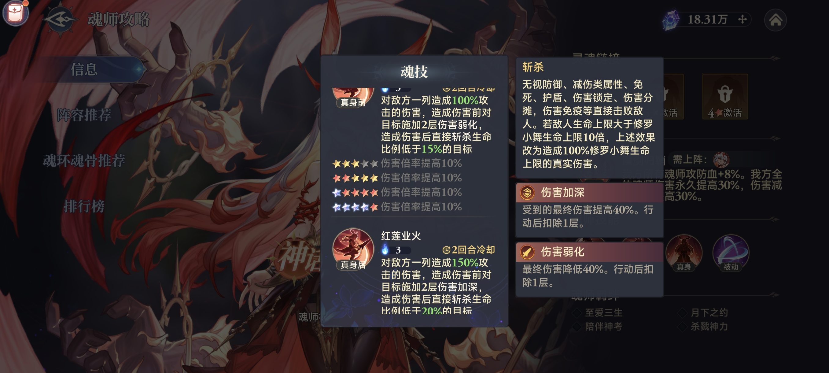 魂技真身前为100%系数列攻,并在攻击前附加【伤害弱化】,攻击后直接斩杀血量低于15%目标。