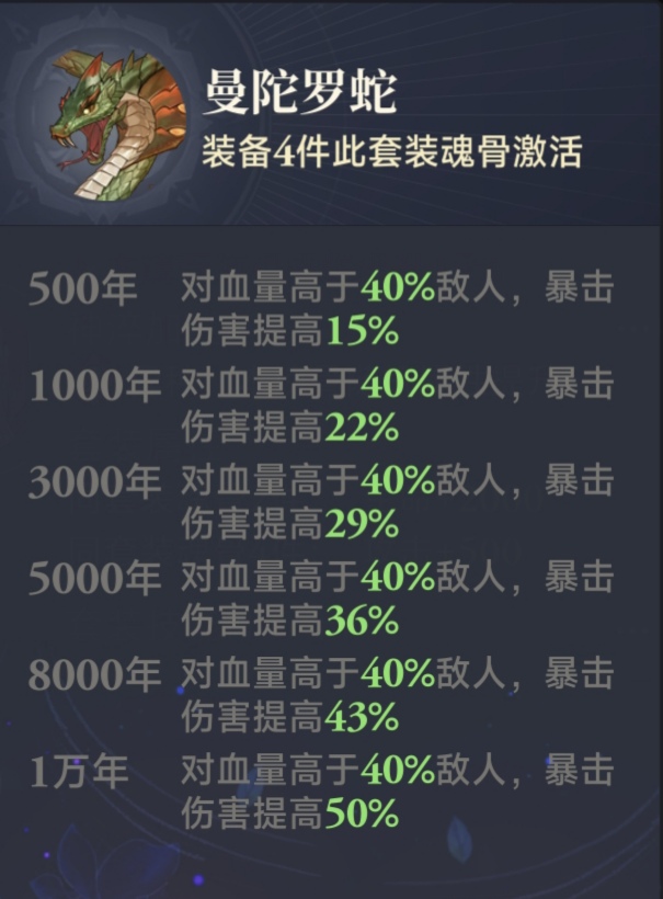 推荐原因:修罗小舞因为其普攻和魂技对低血量目标带有斩杀效果,需要更快压低敌人血量,所以跟曼陀罗蛇的对高血量目标增伤更为契合。
