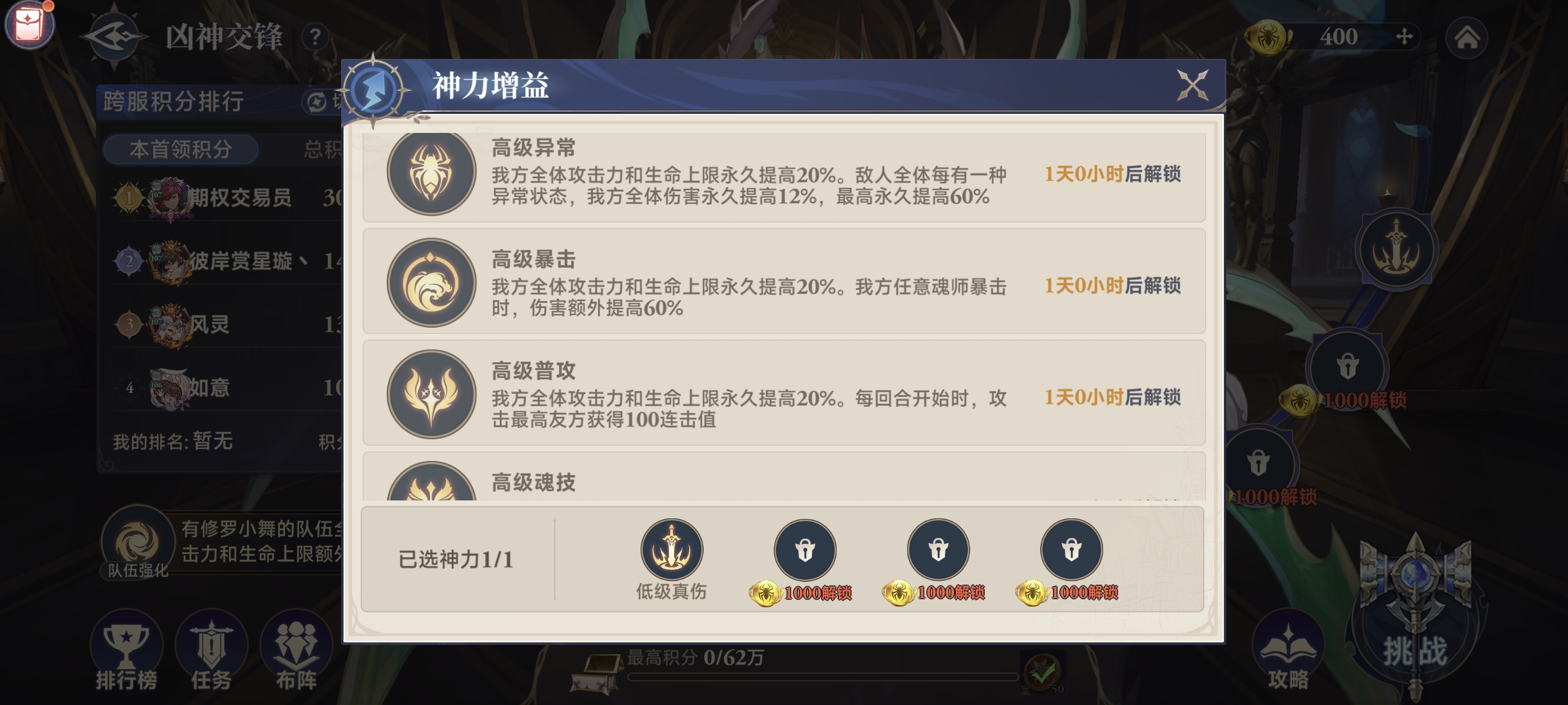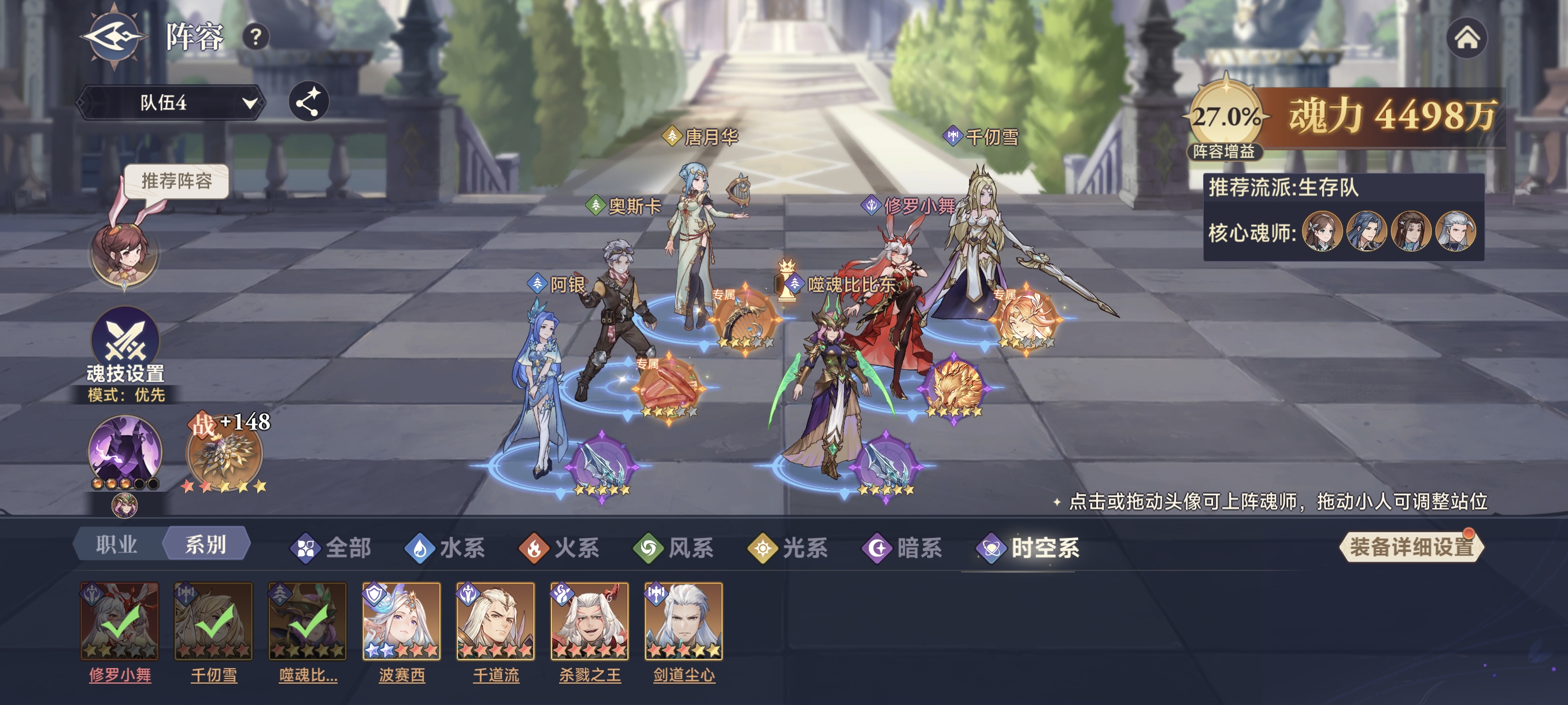 在时空副本中,修罗小舞所在的队伍更适合选择:高级异常+高级暴击+高级普攻+高级魂技这四种神力增益。