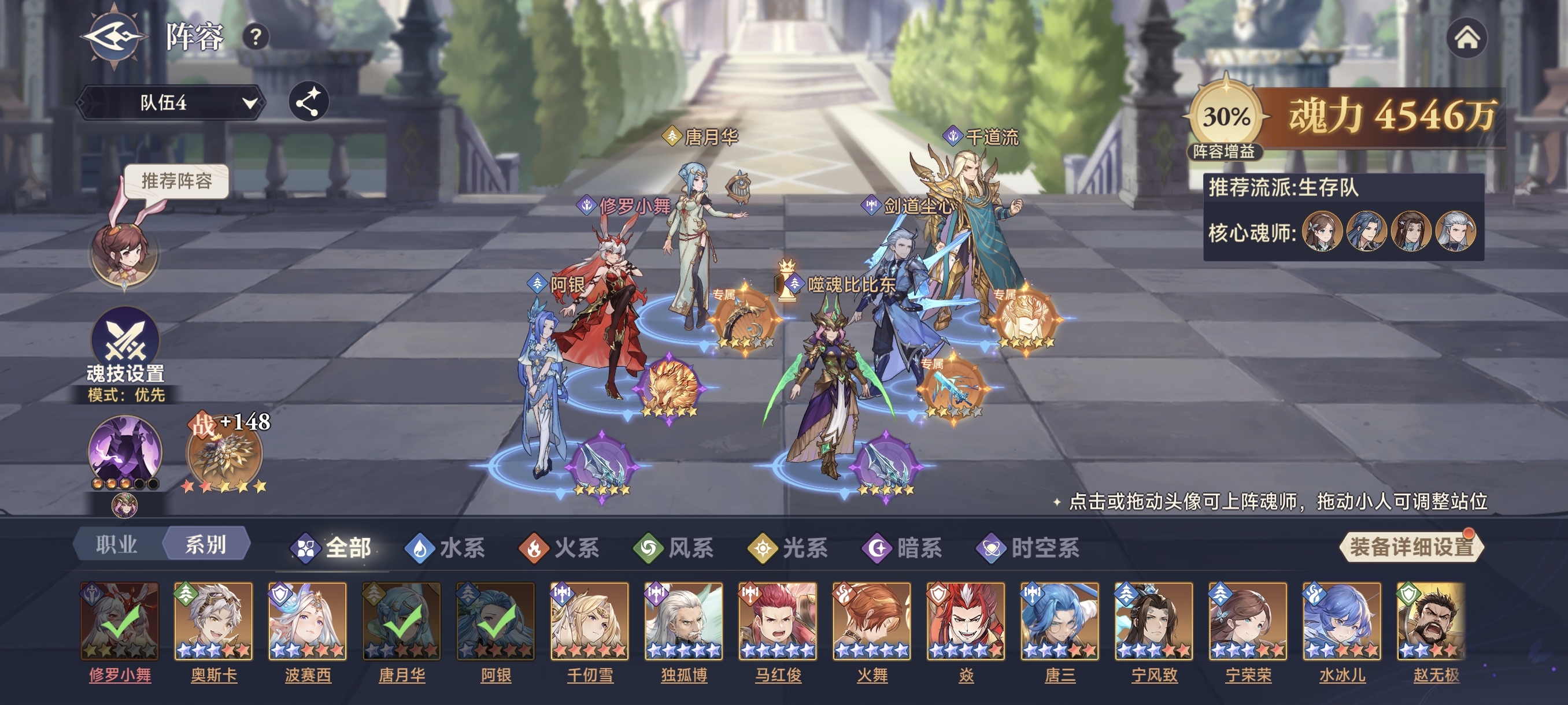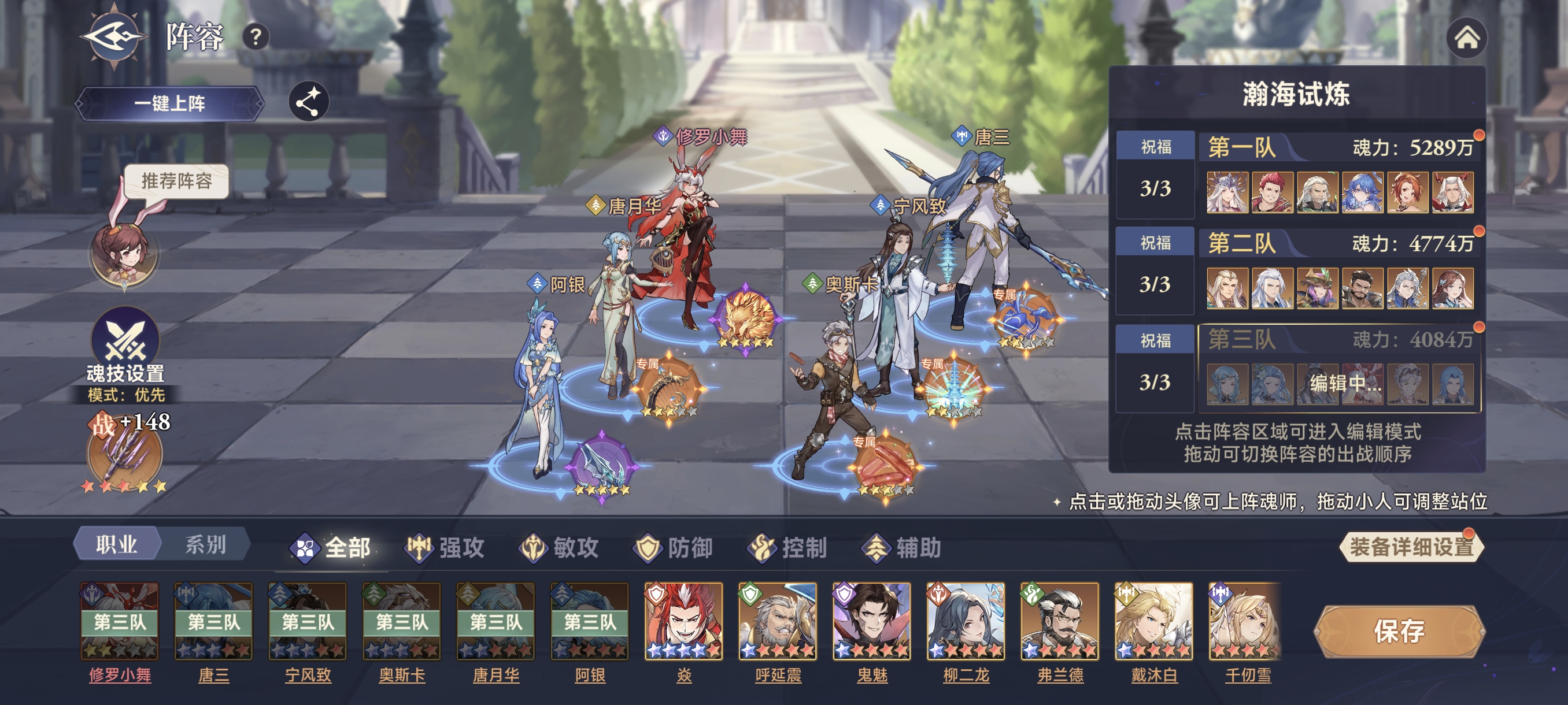 瀚海试炼中,可以直接进入唐三暴击阵容,替换掉千仞雪,辅助选择增加暴击、暴伤、连击的唐月华+阿银+奥斯卡组合,最大化增幅修罗小舞的输出。