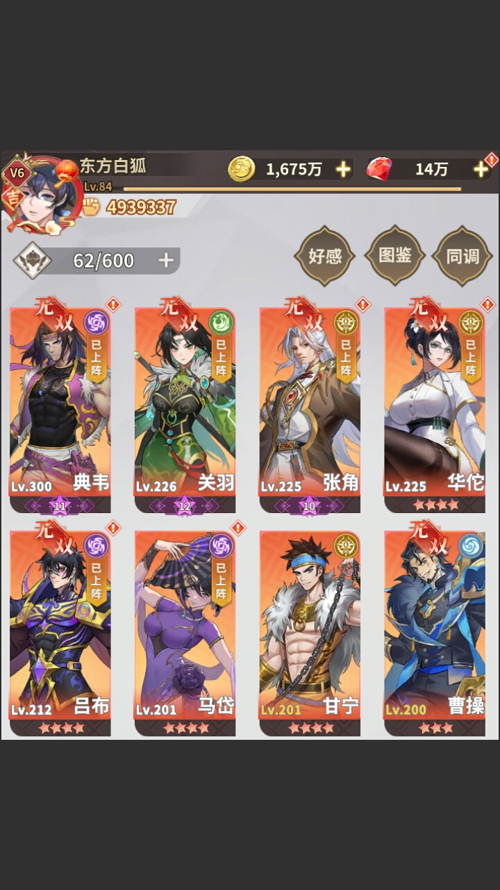 另外虽然12星开启灵魂技(需要六星以上三系无双),但白嫖由于本体、狗粮压力不用急着升12,最重要的还是把每周的典韦、张角都换了,能不能逆袭就靠这两白嫖光暗了