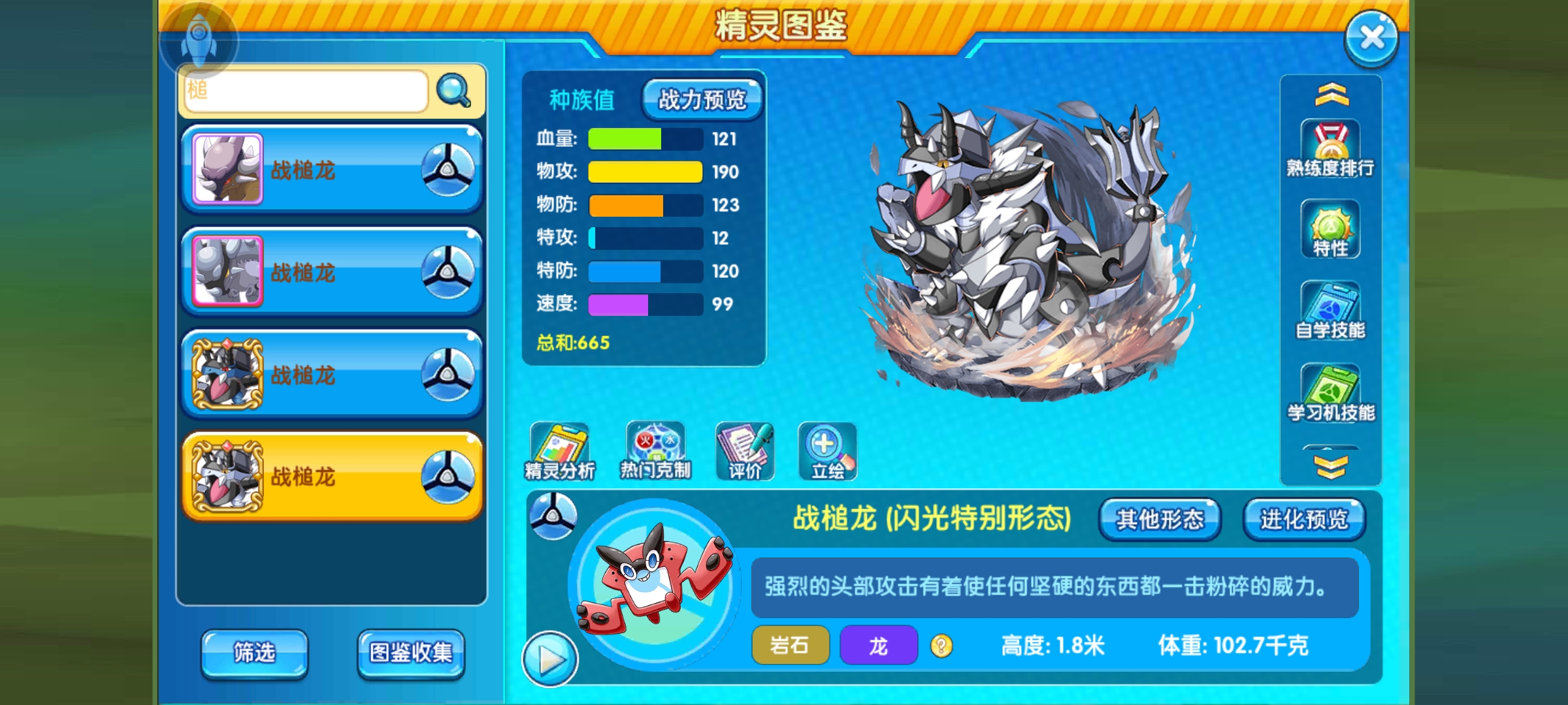 从战槌龙种族值面板来看,是个强力的物攻手,凭借190的物攻,足够驰骋第二梯队,99的速度面板配合特性将其提升,物防123的面板与120的特防面板相差不大,不需要的12的特攻面板很合理,121的血量面板也是十分合理的。