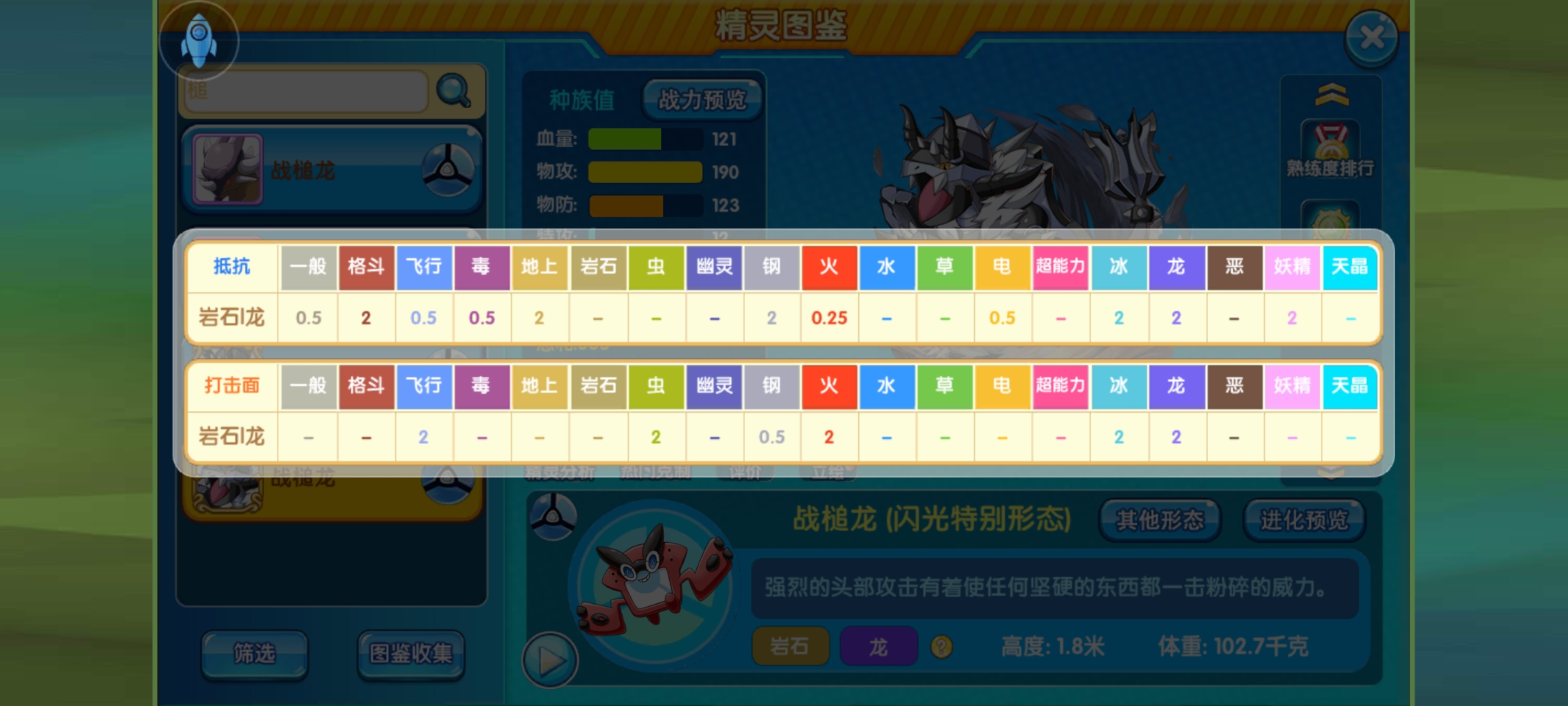 闪光战槌龙的属性是岩石+龙,弱二倍格斗、妖精、地上、钢、冰、龙这六个属性,抵抗岩石系和龙系,克制飞行、火、虫、冰、龙这五个属性,这样的面板总体来说是不错的,