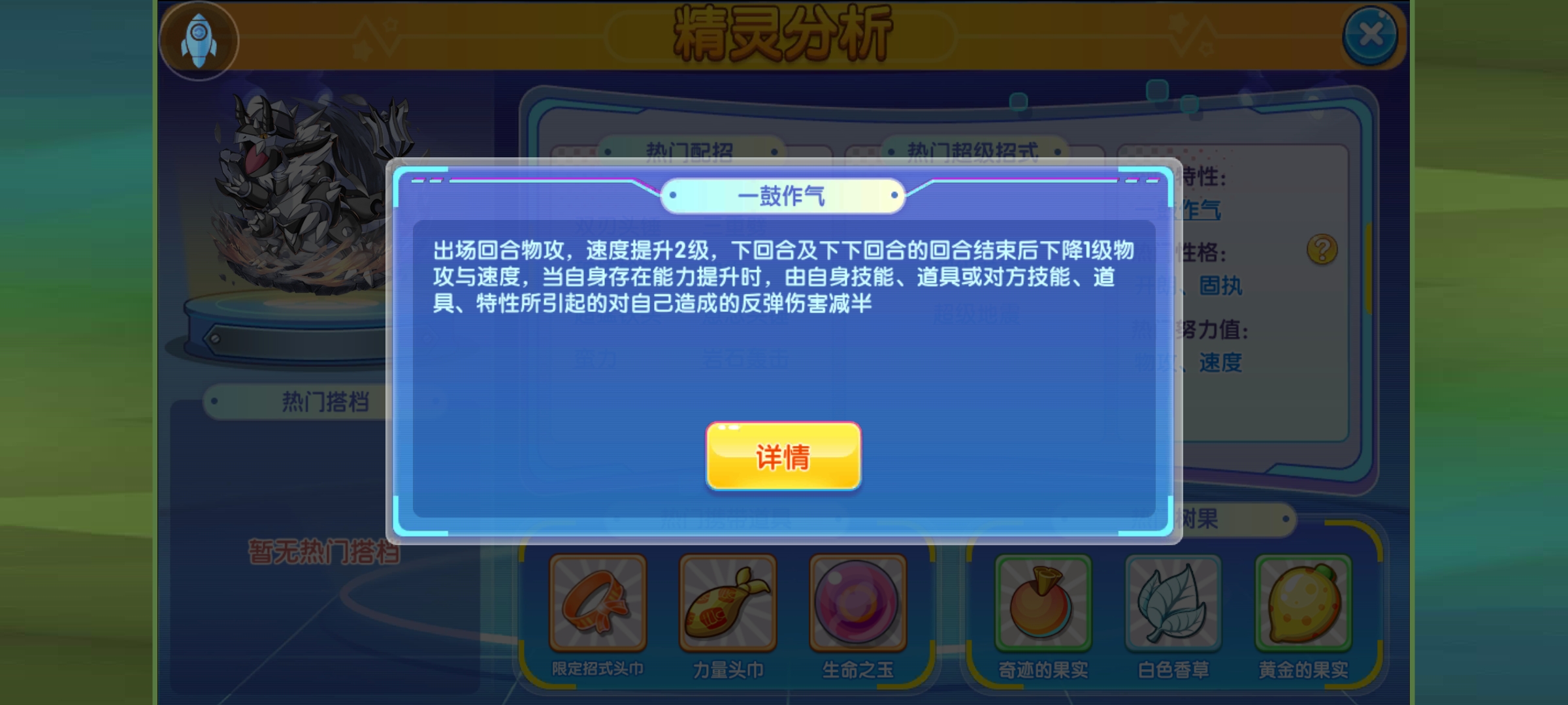一鼓作气特性开局物攻速度加二,随回合数递减,可以看出来,战槌龙的强势期在特性的第一个回合和第二个回合,而第三个回合攻击速度都减一所以一旦战槌龙速度减一和攻击减一这个时候就不是战槌龙强势期,在这小编不建议战槌龙继续战场下去,第二战槌龙特性对反伤伤害减半,也就是说,如果战槌龙的携带物是命玉的话,每次使用技能只会减速1/20的血量。