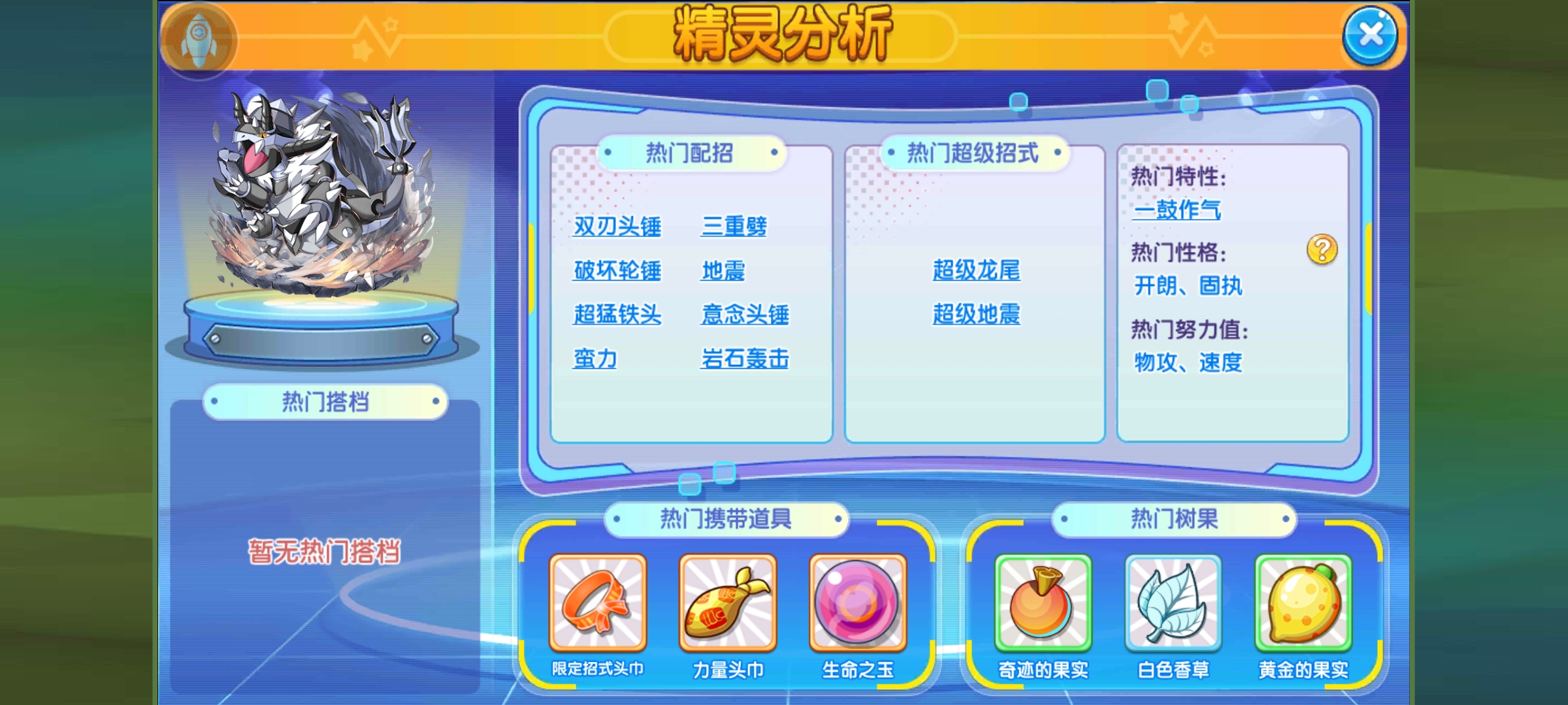 3.超猛铁头:妖精系大家还是清楚的吧,要想打目前强势妖精系并不是一个轻松的事,对于绝大多数玩家而言,但超猛铁头却不一样,即便类似苍响那种属性是钢妖的,妖精被钢克制,符合举例的第一种,也就是,战槌龙完全可以凭借特性的加成用超猛铁头打苍响。