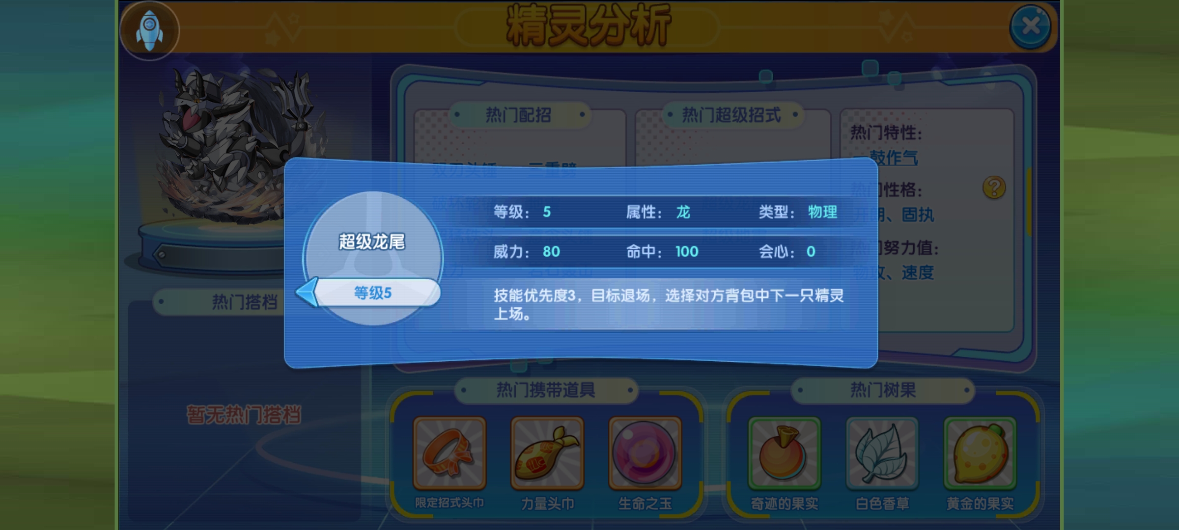 在超级招式的选择上,超龙尾最适合不过,遇到版本强势的可以甩走。