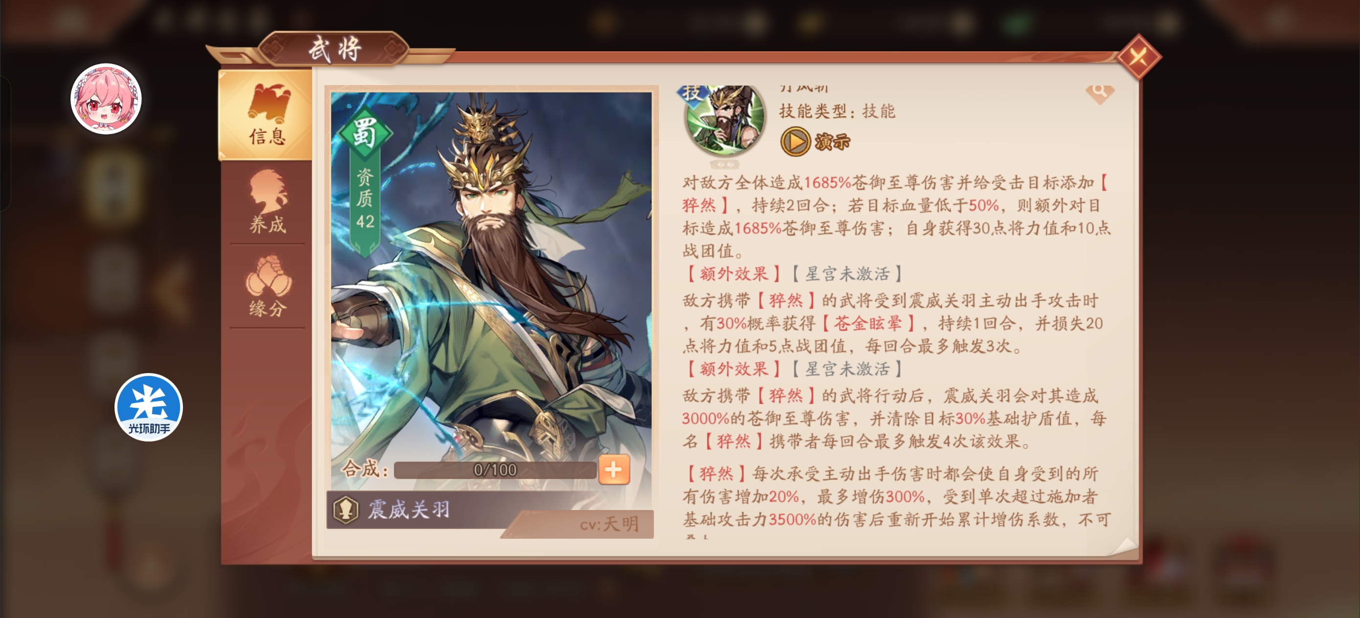 震威关羽也是免疫控制增伤 额外武将技 斩杀 眩晕 很难评 看技能强度很高 但之前龙魂有过翻车的记录 又少一个全体减伤 暂时把他放张辽后面 强度第二